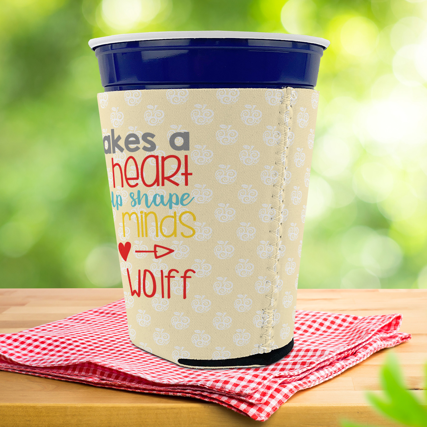Made from neoprene with a polyester outer fabric and sewn seams, these premium quality party cup sleeves are very durable and will hold up to heavy use. They are available in 2 styles - with a bottom or just a sleeve to go around the outside of the tapered cup. The sleeve covers are about 4" tall and cover about 90% of the classic 16 oz. Solo cup.