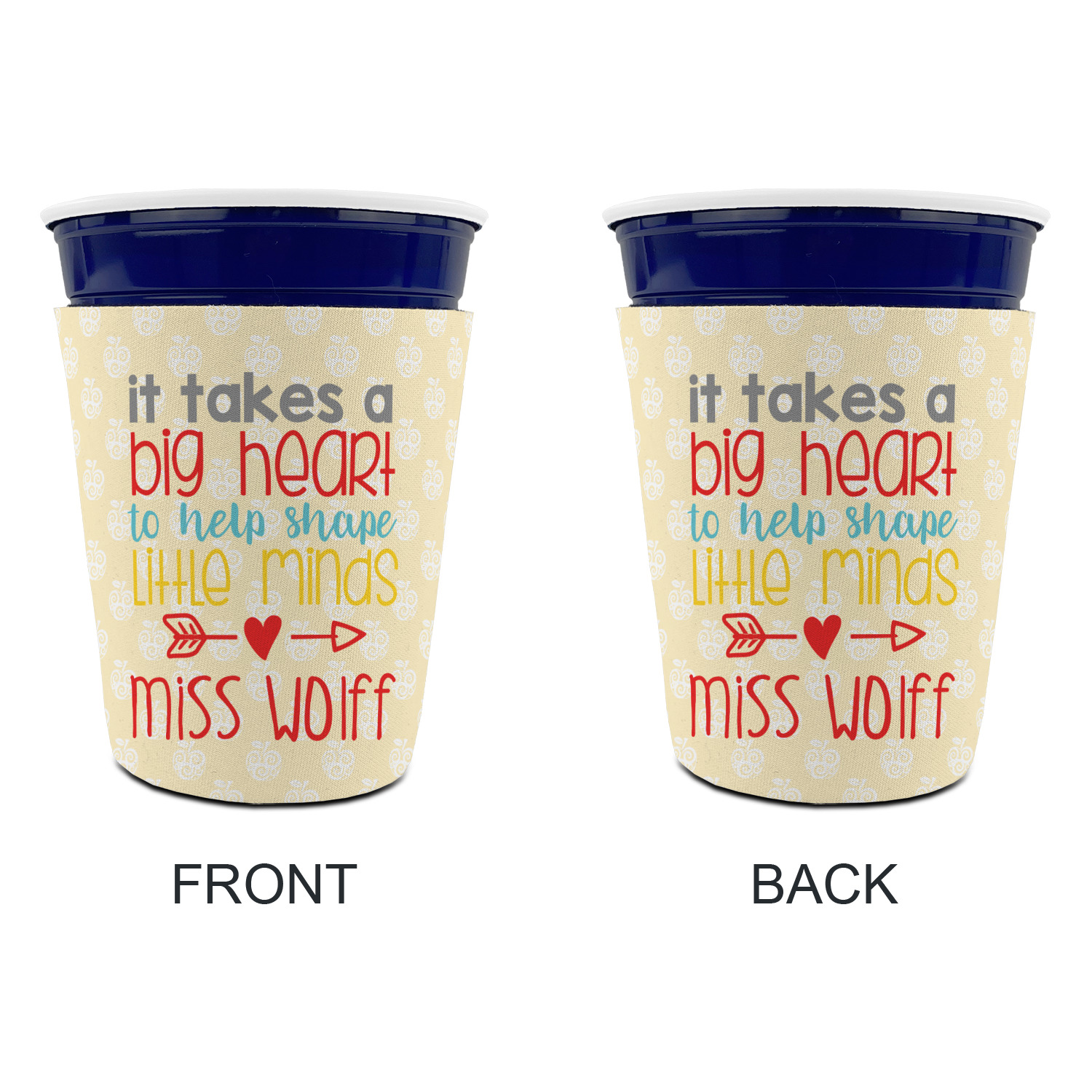 Made from neoprene with a polyester outer fabric and sewn seams, these premium quality party cup sleeves are very durable and will hold up to heavy use. They are available in 2 styles - with a bottom or just a sleeve to go around the outside of the tapered cup. The sleeve covers are about 4" tall and cover about 90% of the classic 16 oz. Solo cup.