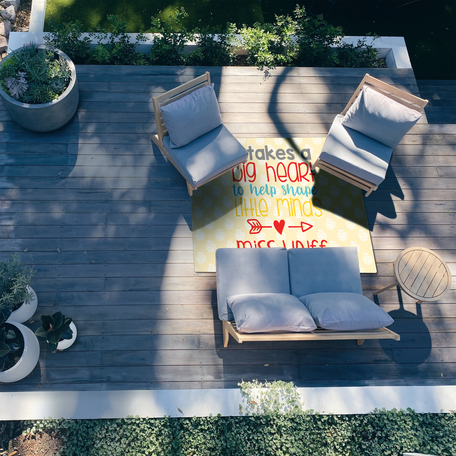 Our custom patio area rugs are velvety soft and smooth, with a short pile, beautiful sewn corners and edges for a refined and exquisite finished look. The poly chenille face is printed with your design and is sure to brighten up any room with its fabulous look. They have just enough cushion to feel comfortable under foot but not soak up water in the weather and offer a quick drying material.