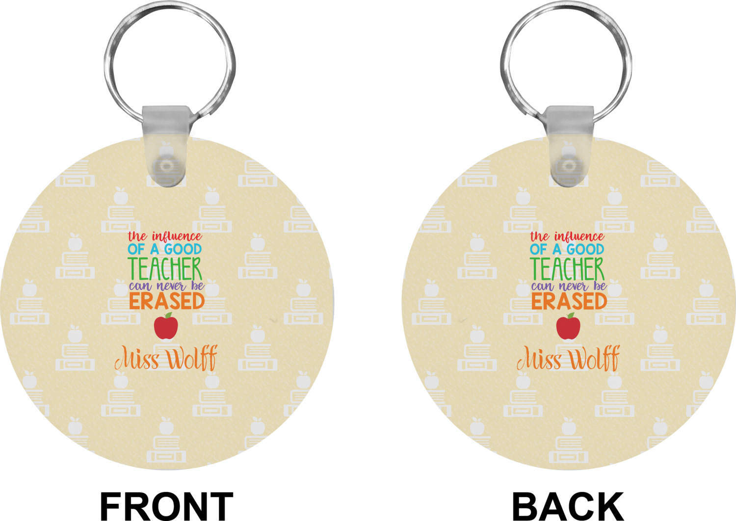 Our personalized keychains attach to the included metal, split key ring with a plastic, removable snap. Since a metal ring is included with your purchase, you have the liberty to keep your keys together on the ring, with or without your unique keychain. We offer this keychain in three different shapes: circle, heart, or diamond. We print your personalized design(s) on both sides of the key chain, and the surface has a glossy, reflective finish that only emphasizes your design. Each keychain is approximately 2.25 by 2.25 inches.