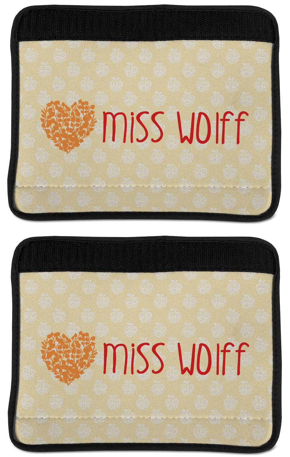 Made from neoprene, our seat belt strap covers wrap around the belt itself and have a Velcro tab for easy attachment and closure. The belt's edges are trimmed with a black polyester for a secure finish. Each cover is 9.5 by 7 inches when open and 9.5 by 2.5 inches when closed. We print your personalized design on the face of the seat belt pad.