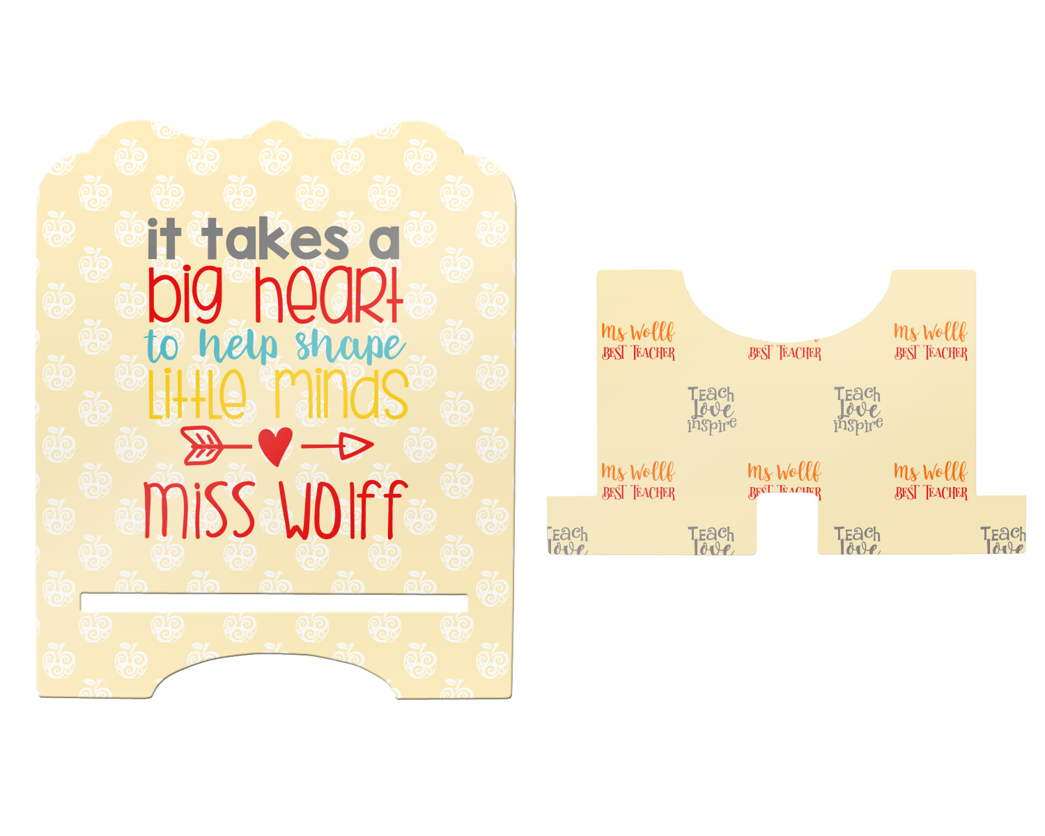 The stand is comprised of two hardboard pieces that fit snugly together and stabilize one another. The bottom part of the iPad stand supports your tablet, and has space for your tablets charger while in use. At 9.25" x 11.5", this tablet mount can support a device between the sizes of the iPad Pro and the iPad Mini 2. The uppermost part of the stand features a decorative, curved edge for a classy, suave appearance. We print your customization atop the face of the stand, in vibrant color. The remaining sides are colored a sleek black.