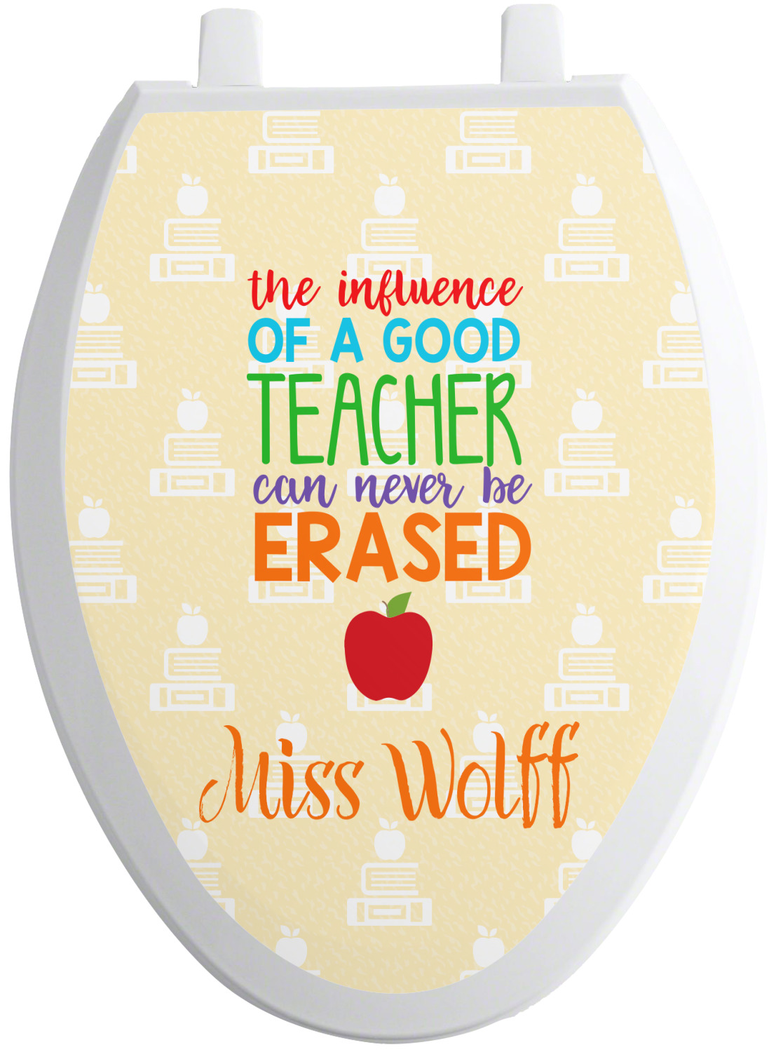 We sell these toilet lid decals in two different shapes to accommodate a wider range of toilet seat shapes. The first shape is our standard, round size, which measures at 13.5 by 12 inches. Our second option is an elongated shape, suited for long toilet seat covers. It measures 15 by 12 inches.