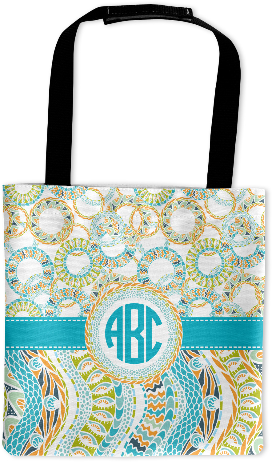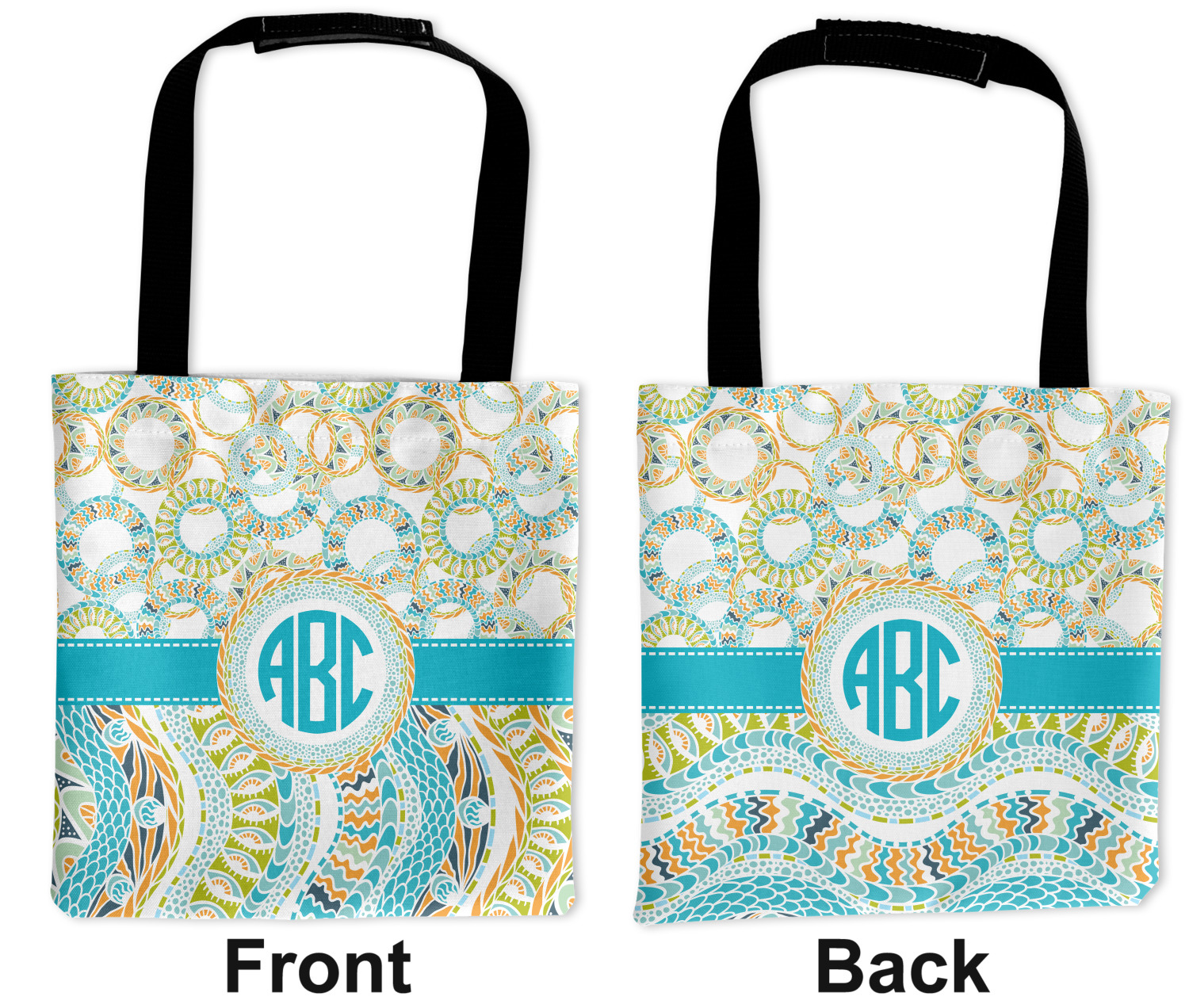 This design takes abstract to the next level by adding fun colors of teal, lime green, and orange to the traditional black and white. On the top half of the design, the design elements are circular; on the bottom half, wavy ribbons.