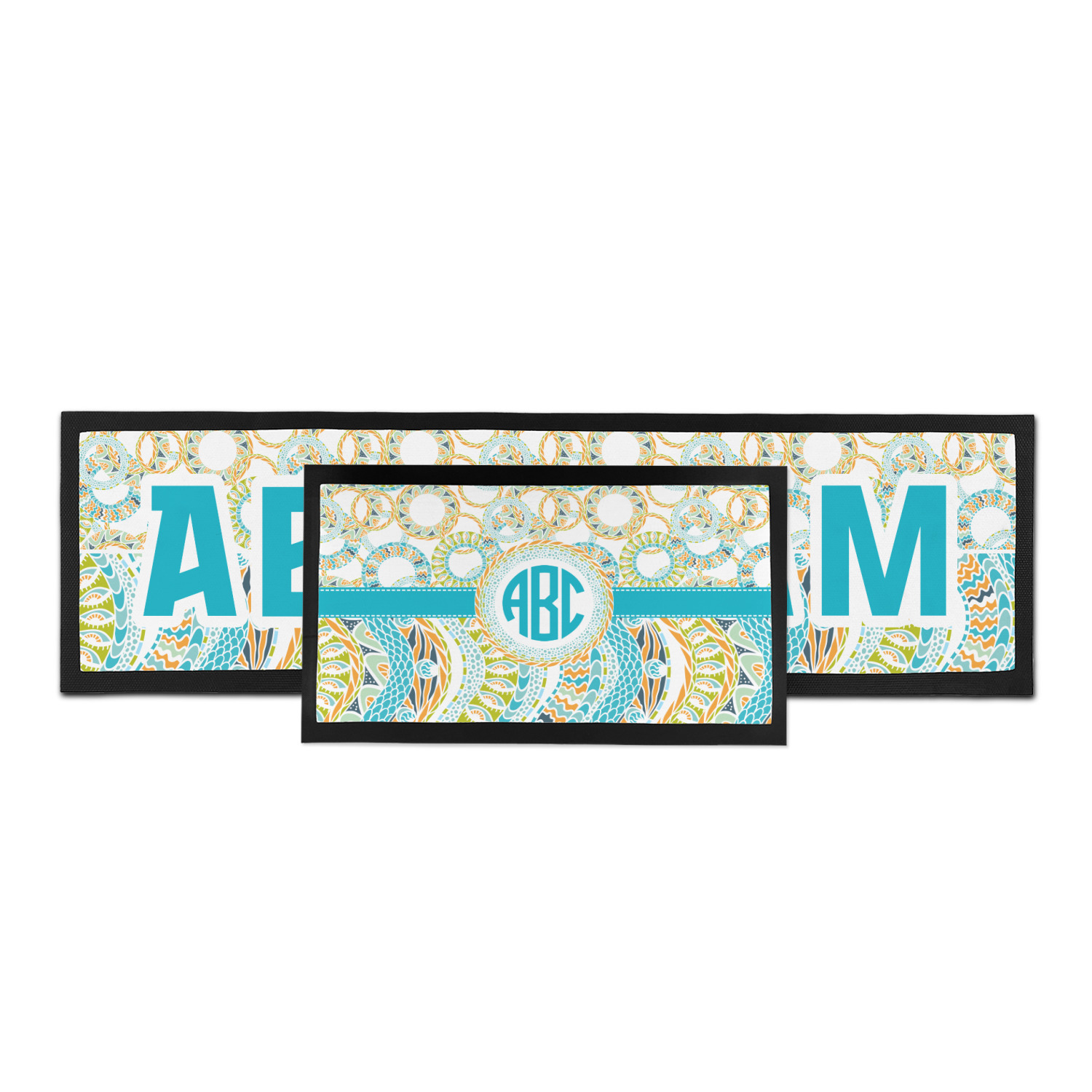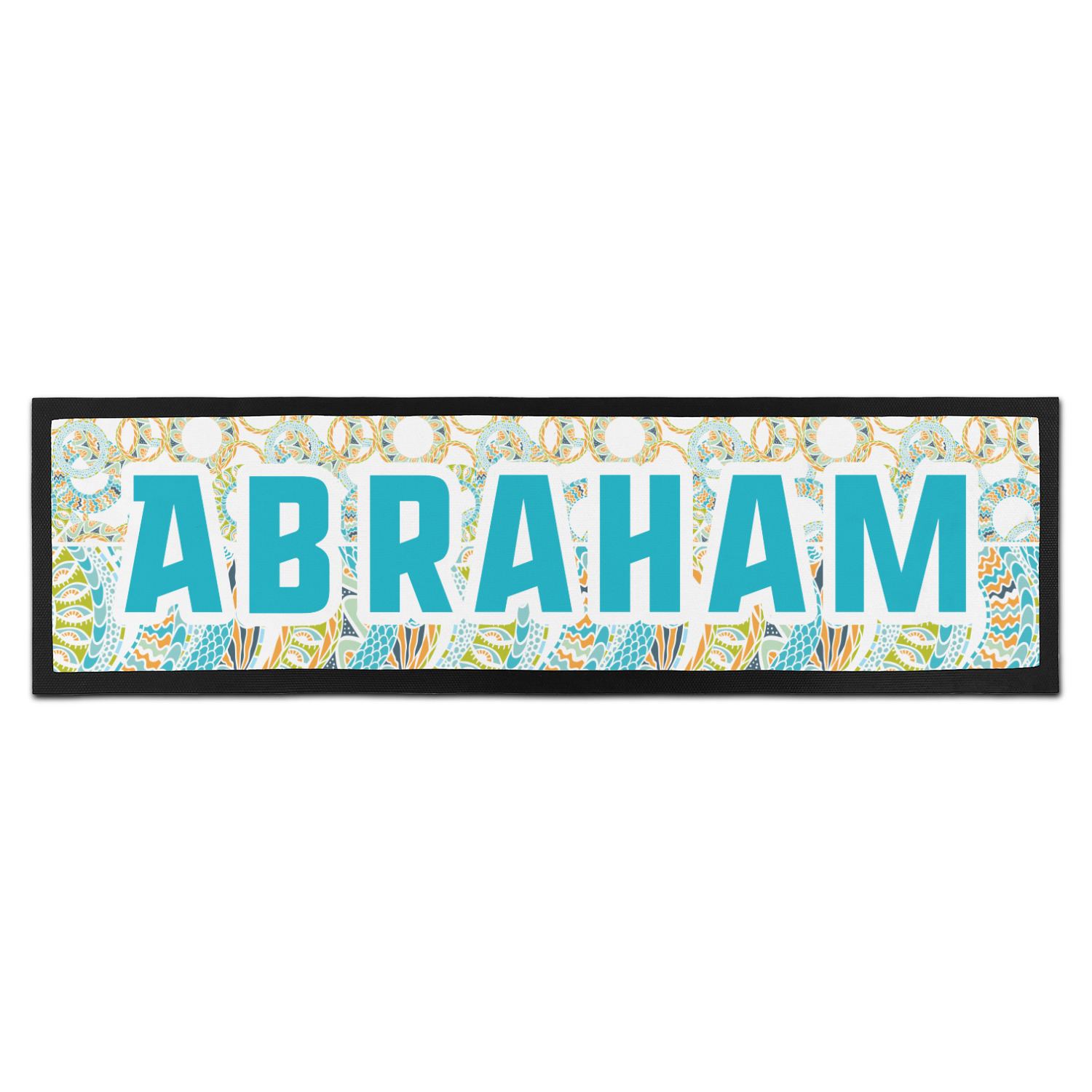 This design takes abstract to the next level by adding fun colors of teal, lime green, and orange to the traditional black and white. On the top half of the design, the design elements are circular; on the bottom half, wavy ribbons.