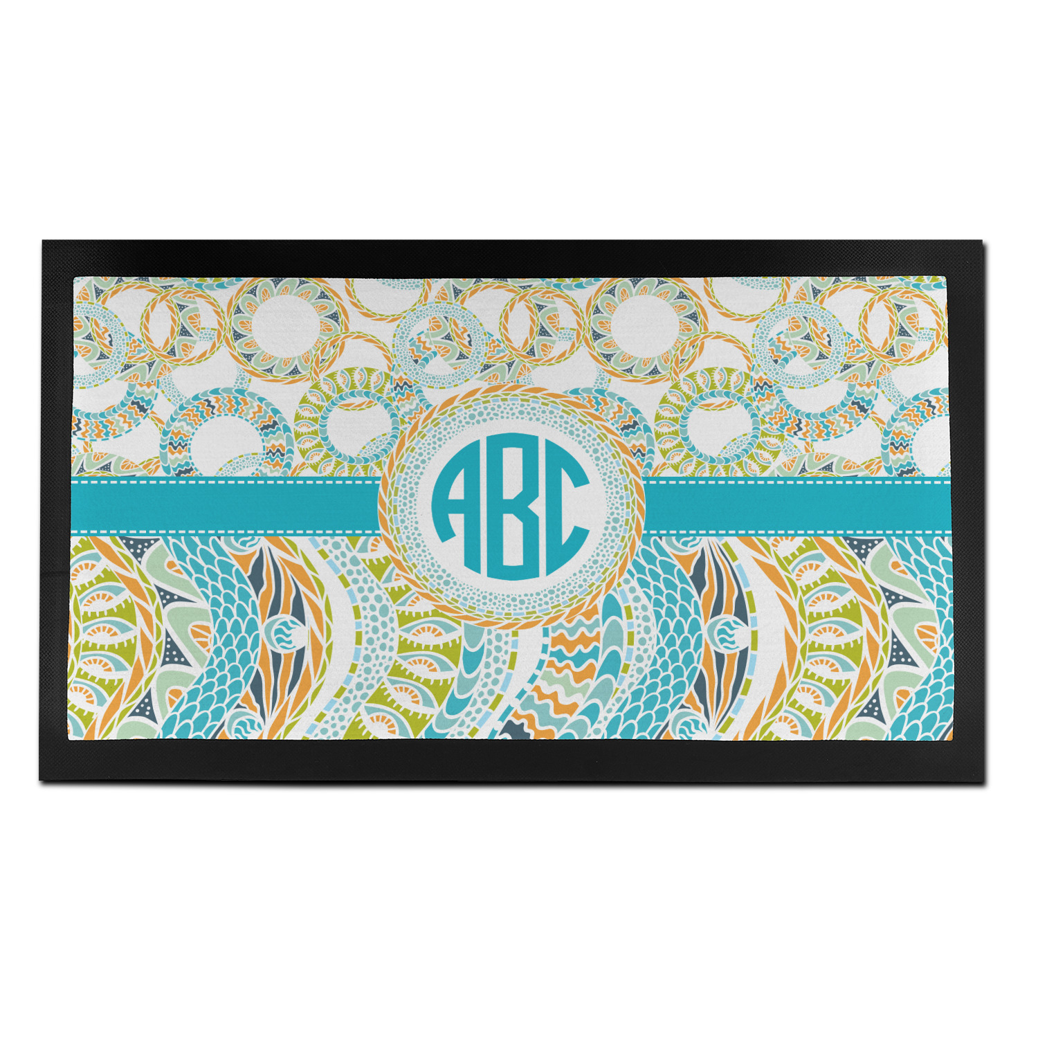 This design takes abstract to the next level by adding fun colors of teal, lime green, and orange to the traditional black and white. On the top half of the design, the design elements are circular; on the bottom half, wavy ribbons.