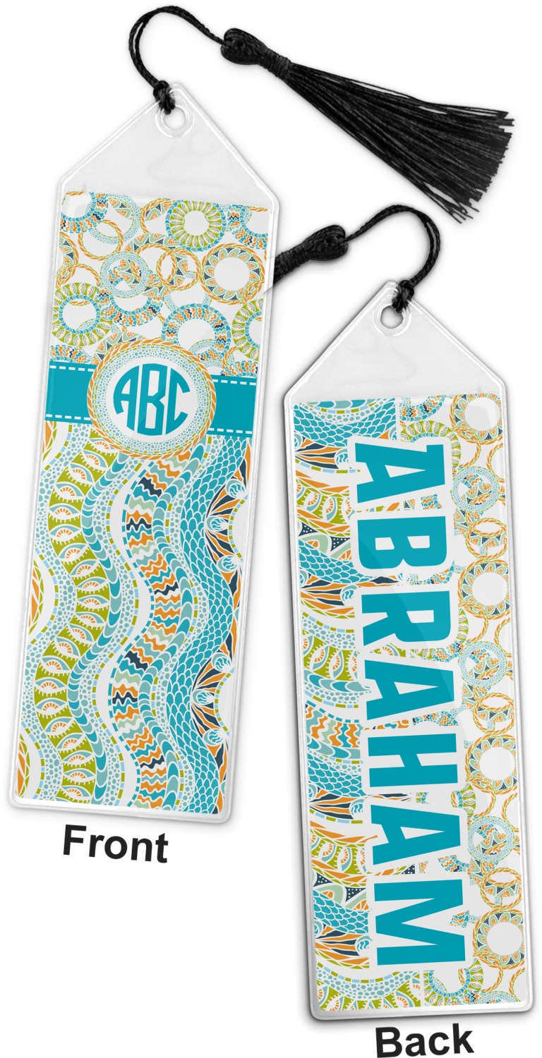 Your personalized bookmark is made of a sturdy, clear vinyl, and is approximately 7.5" x 2.25". We display your personalization on vinyl inserts that are placed on both sides. Accompanying each book marker is a black, fringe tassel that attaches to the reinforced, triangular header.