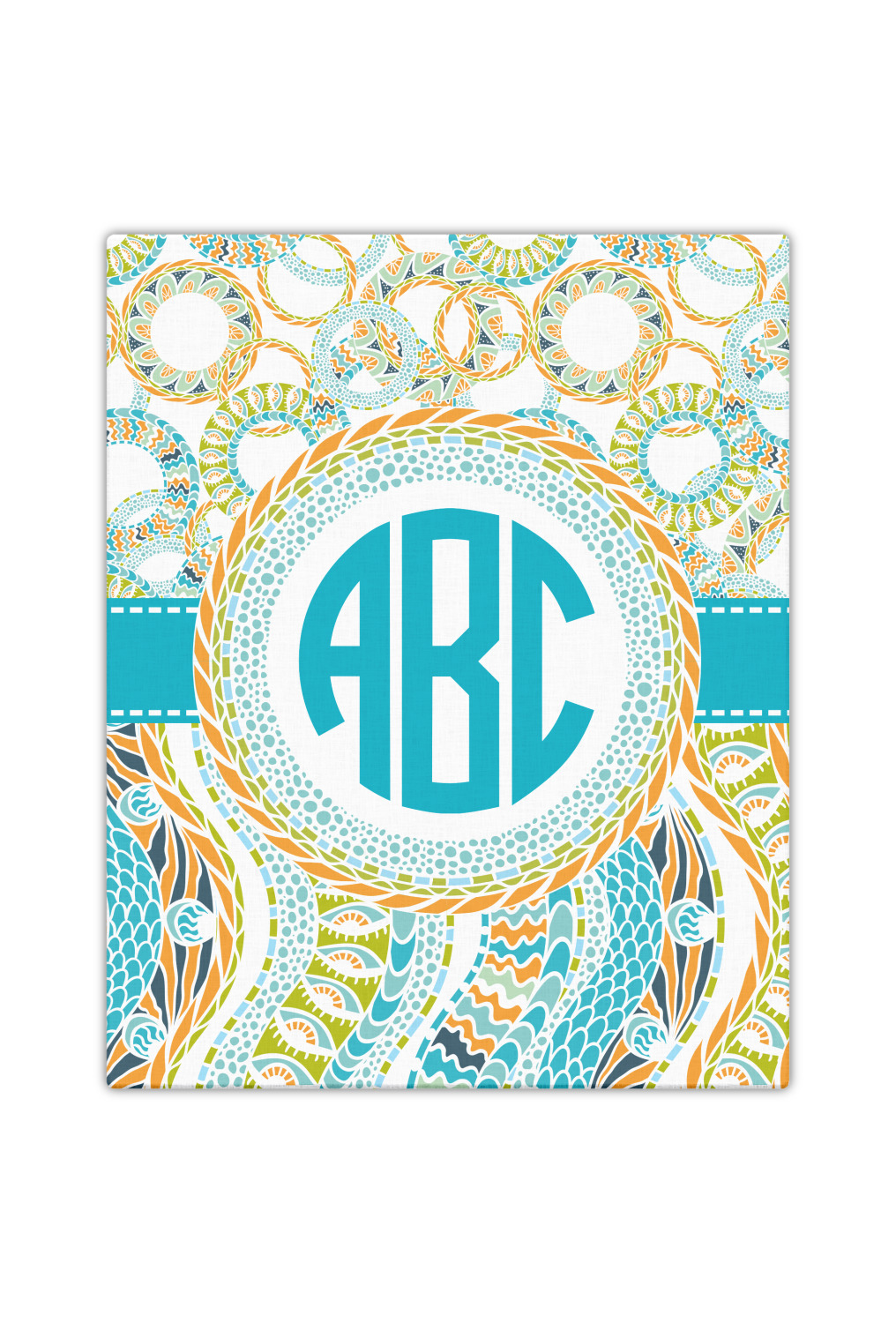 This design takes abstract to the next level by adding fun colors of teal, lime green, and orange to the traditional black and white. On the top half of the design, the design elements are circular; on the bottom half, wavy ribbons.