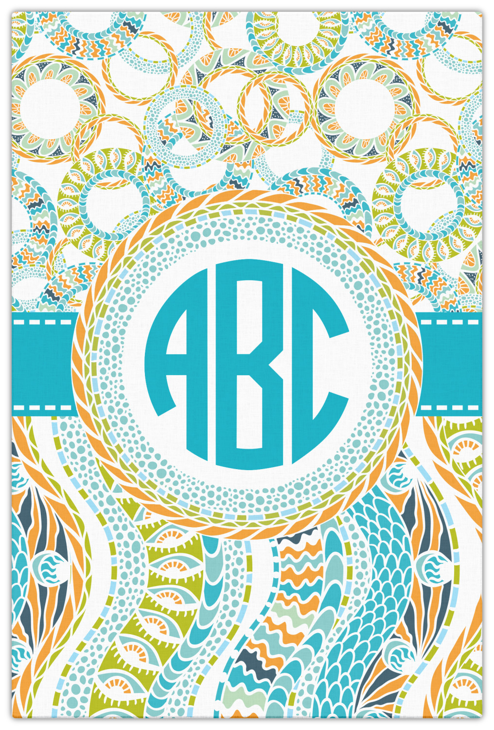 This design takes abstract to the next level by adding fun colors of teal, lime green, and orange to the traditional black and white. On the top half of the design, the design elements are circular; on the bottom half, wavy ribbons.