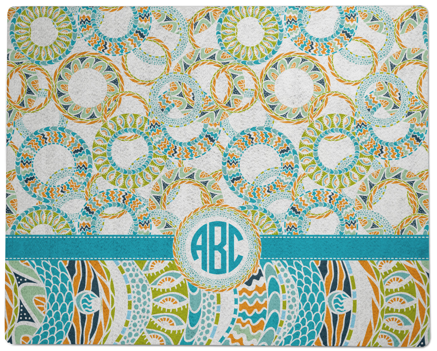 This design takes abstract to the next level by adding fun colors of teal, lime green, and orange to the traditional black and white. On the top half of the design, the design elements are circular; on the bottom half, wavy ribbons.
