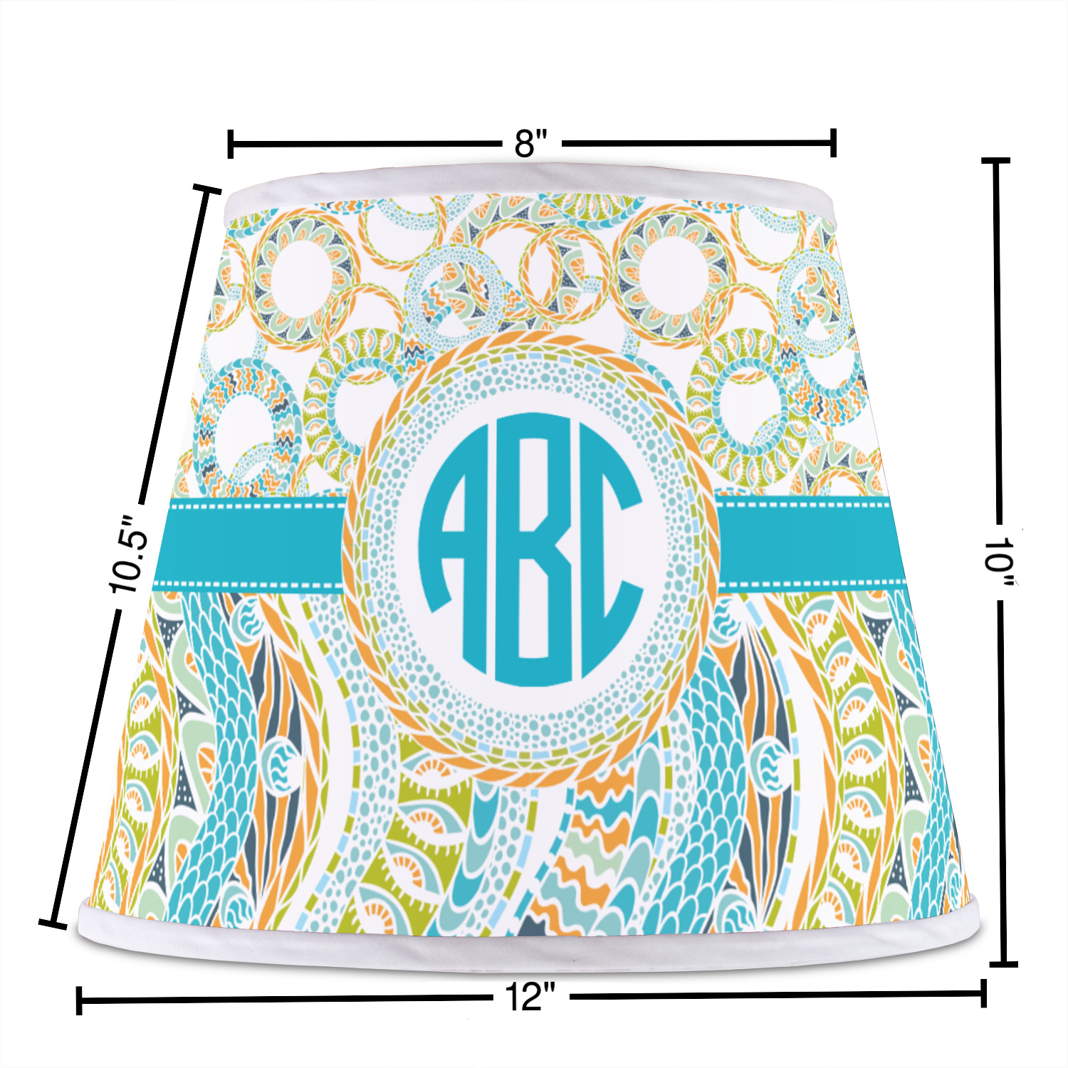 The base of this lampshade is 12 inches in diameter, and the top spans 8 inches in diameter. The total height of the lampshade is 10 inches. The angled nature of this custom lampshade concentrates the light, making it ideal for smaller spaces. This lampshade is made of matte, polyfilm, and displays your customization in its middle. The top and bottom of this colorful lamp shade are lined with a white fabric ribbon (which can be replaced with black inside the design studio) which frames your design and creates a sophisticated finish. As an UNO fitter lampshade, this unique lamp shade will fit a variety of bases.
