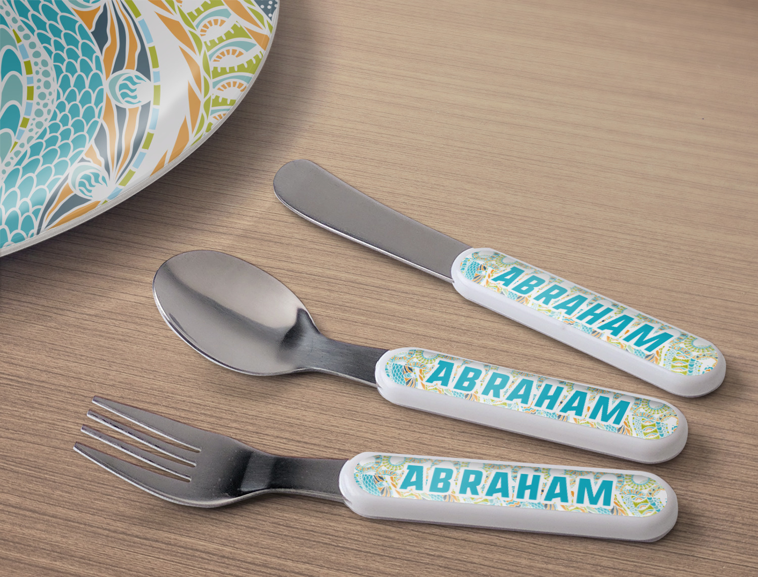 This set of kids' silverware includes a 5.5 inch spoon, fork, and knife, catered to your little one's needs. The prongs of this fork are flat and dull, while our spoon is small enough for tiny mouths, and the dullness of the knife itself resembles a butter knife, at most. These kids' utensils are made of stainless steel, while the handles are crafted from a durable plastic that will withstand the energy and use of your young one. We print your customization across the handles, making the cutlery set unique to your child only.
