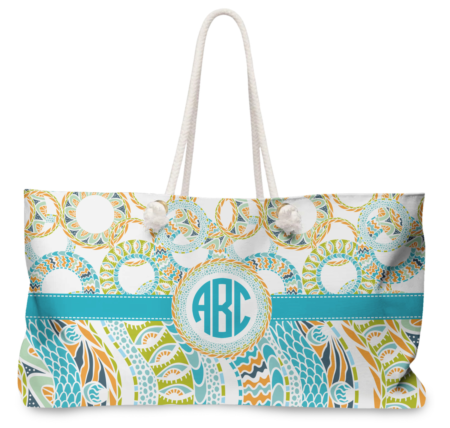 Our oversized weekender tote with rope handles is perfect for your weekend at the beach or on the town. This large tote are 24" W X 13" H, with a 5" gusset and a 27" thick rope handles with a knot that is put through a grommeted brass hole.