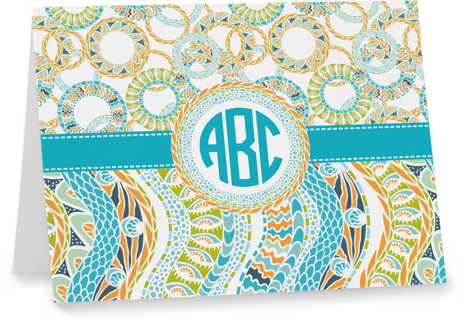 This design takes abstract to the next level by adding fun colors of teal, lime green, and orange to the traditional black and white. On the top half of the design, the design elements are circular; on the bottom half, wavy ribbons.