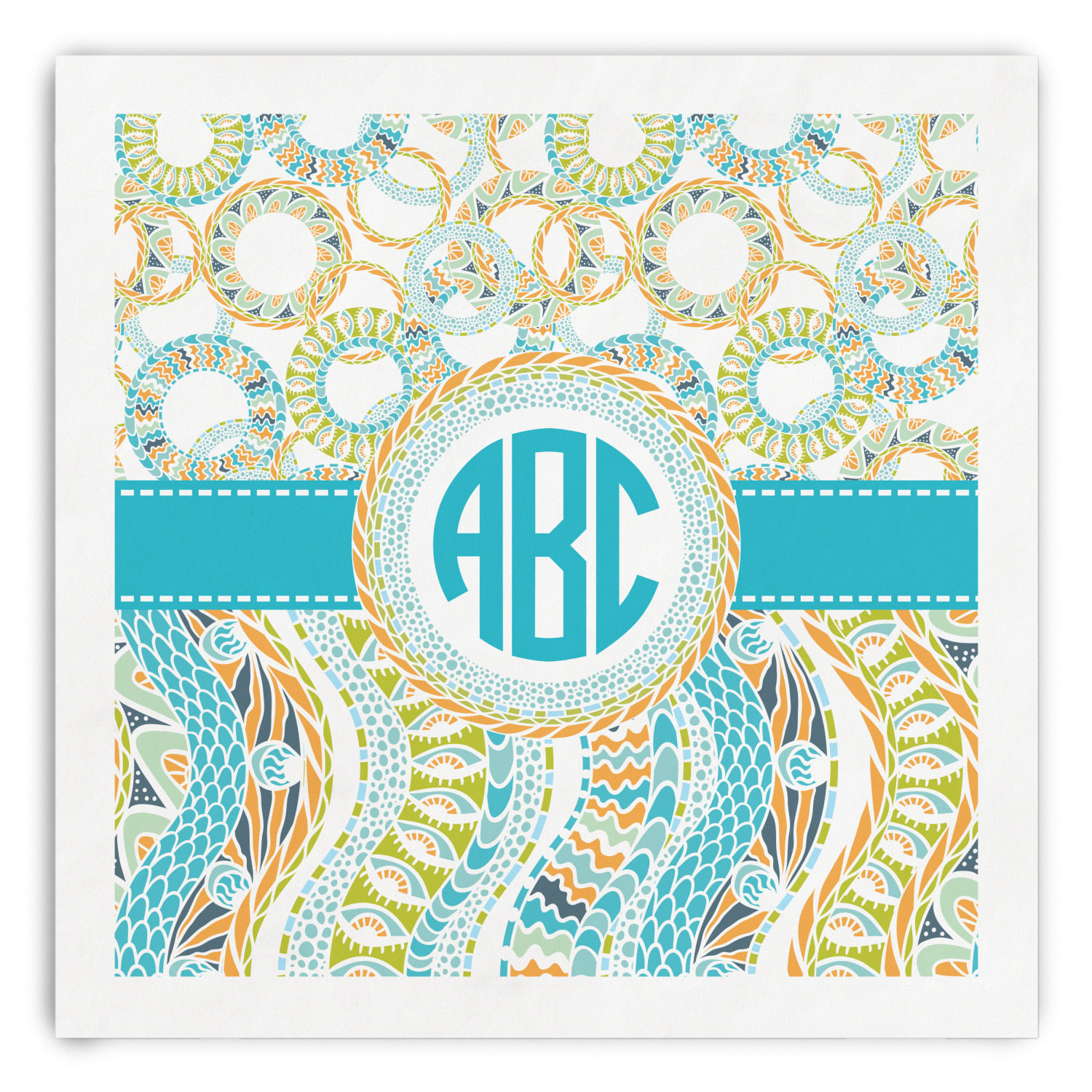 This design takes abstract to the next level by adding fun colors of teal, lime green, and orange to the traditional black and white. On the top half of the design, the design elements are circular; on the bottom half, wavy ribbons.