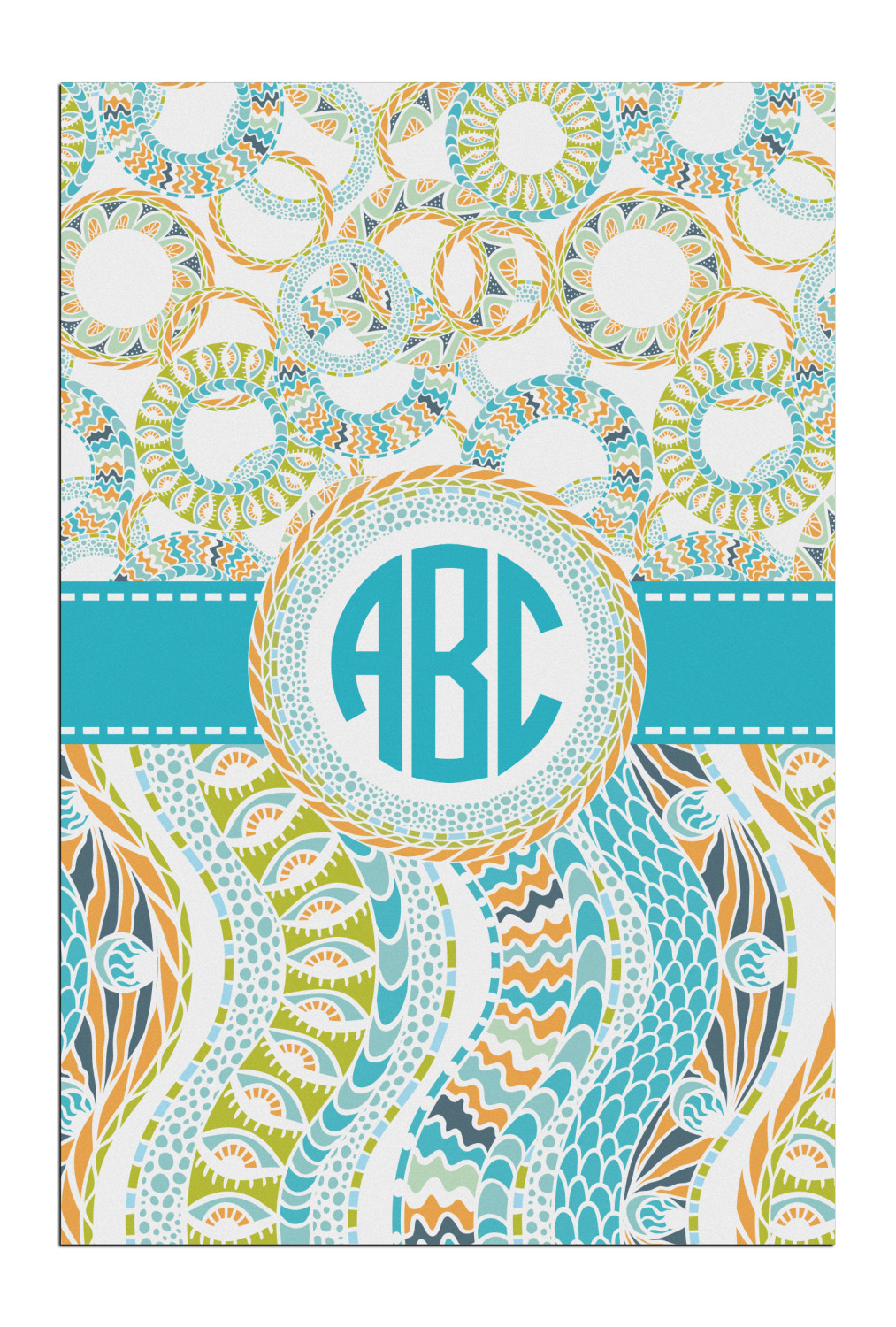 This design takes abstract to the next level by adding fun colors of teal, lime green, and orange to the traditional black and white. On the top half of the design, the design elements are circular; on the bottom half, wavy ribbons.