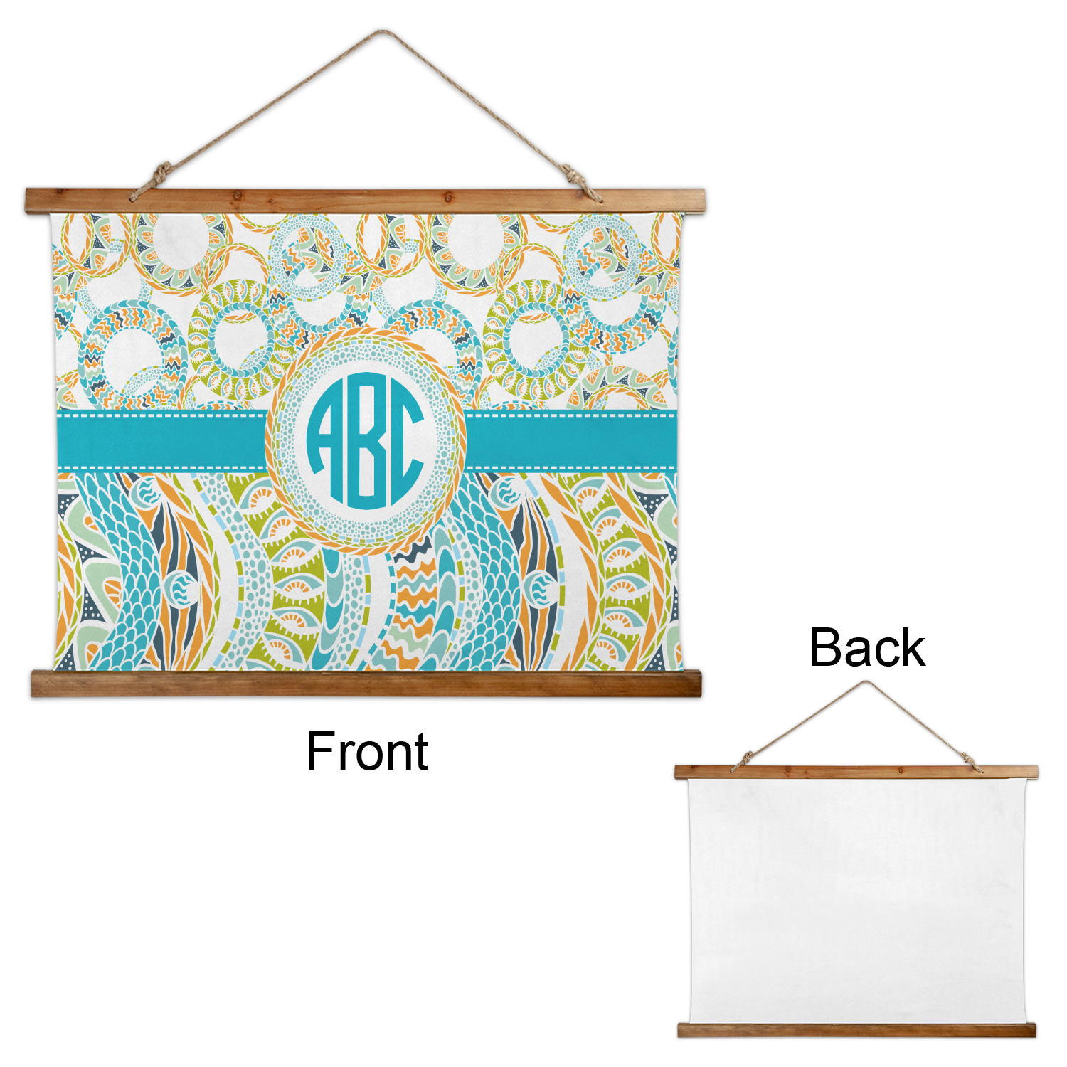 Made in two different orientations - portrait or landscape - both are 26" x 36". Your design is printed on a high quality polyester fabric with hemmed edges. The wood on the top and bottom of the tapestry is 1.25" tall and 0.25" thick and there are two pieces on top and bottom which sandwich the fabric.