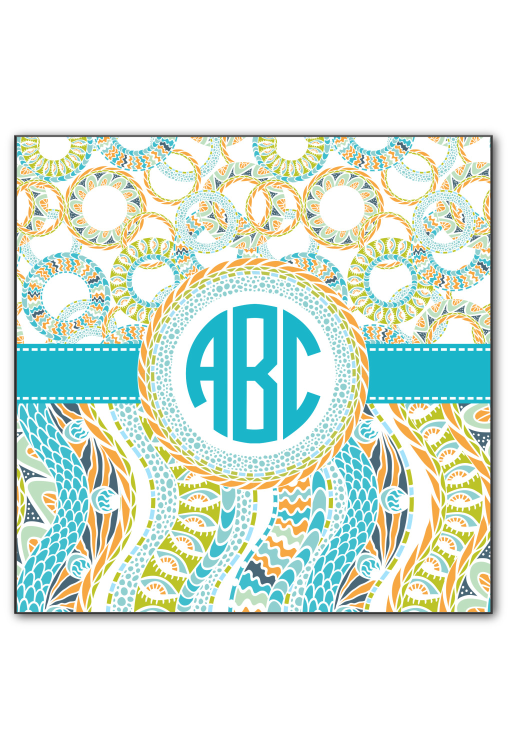 This design takes abstract to the next level by adding fun colors of teal, lime green, and orange to the traditional black and white. On the top half of the design, the design elements are circular; on the bottom half, wavy ribbons.