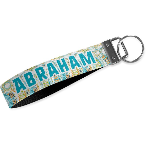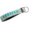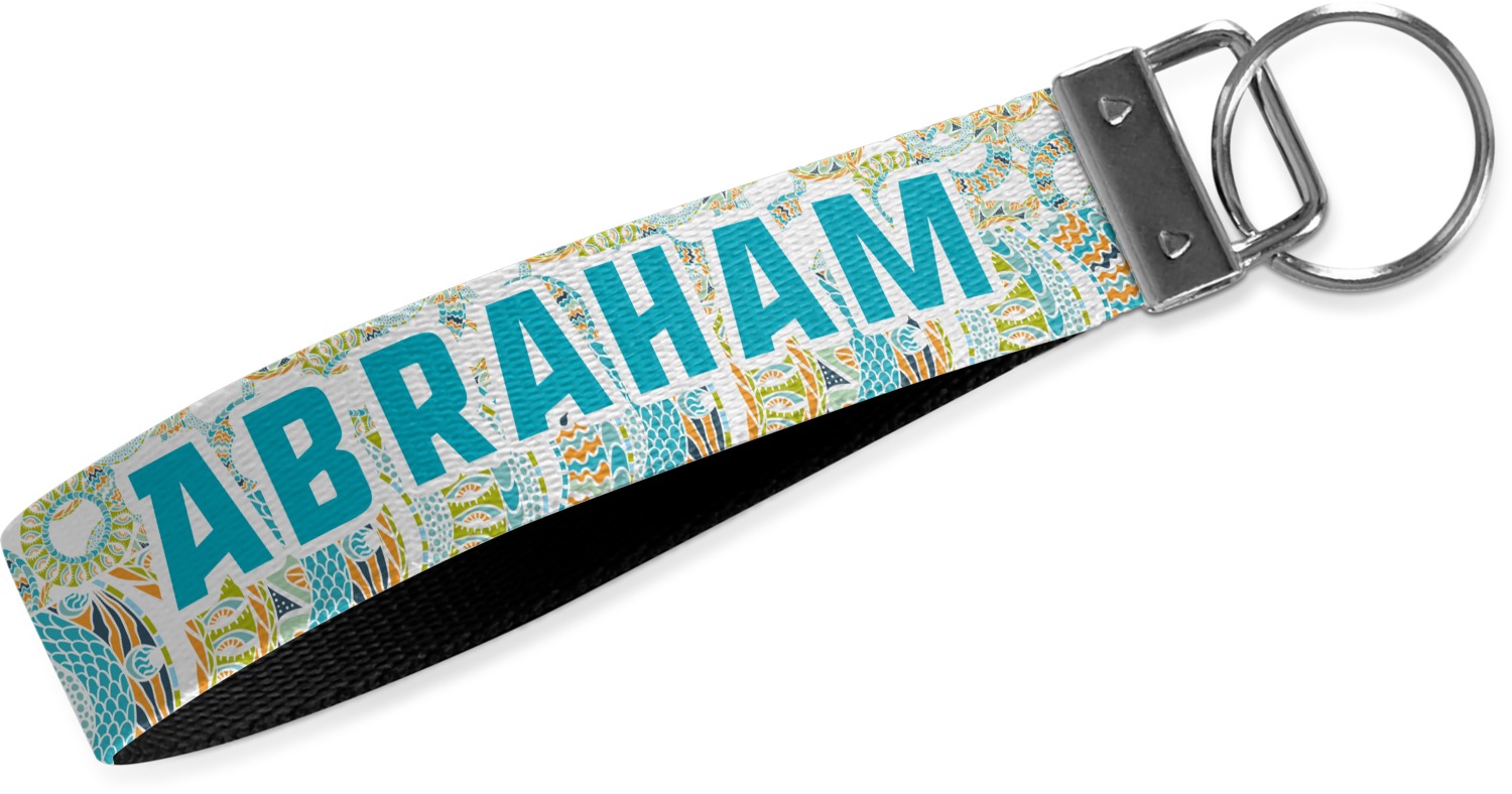 These key fob keychains are made from a polyester weave, right here in the USA. They feature a silver, metal clasp, attached to a round keyring. The piece gives the personalized wristlet a beautiful, finished look. Your customized design is printed on the outside of the keychain strap. We carry these wristlets in two sizes: small, which is 5 inches in width, and large, which is 5.5 inches in width.