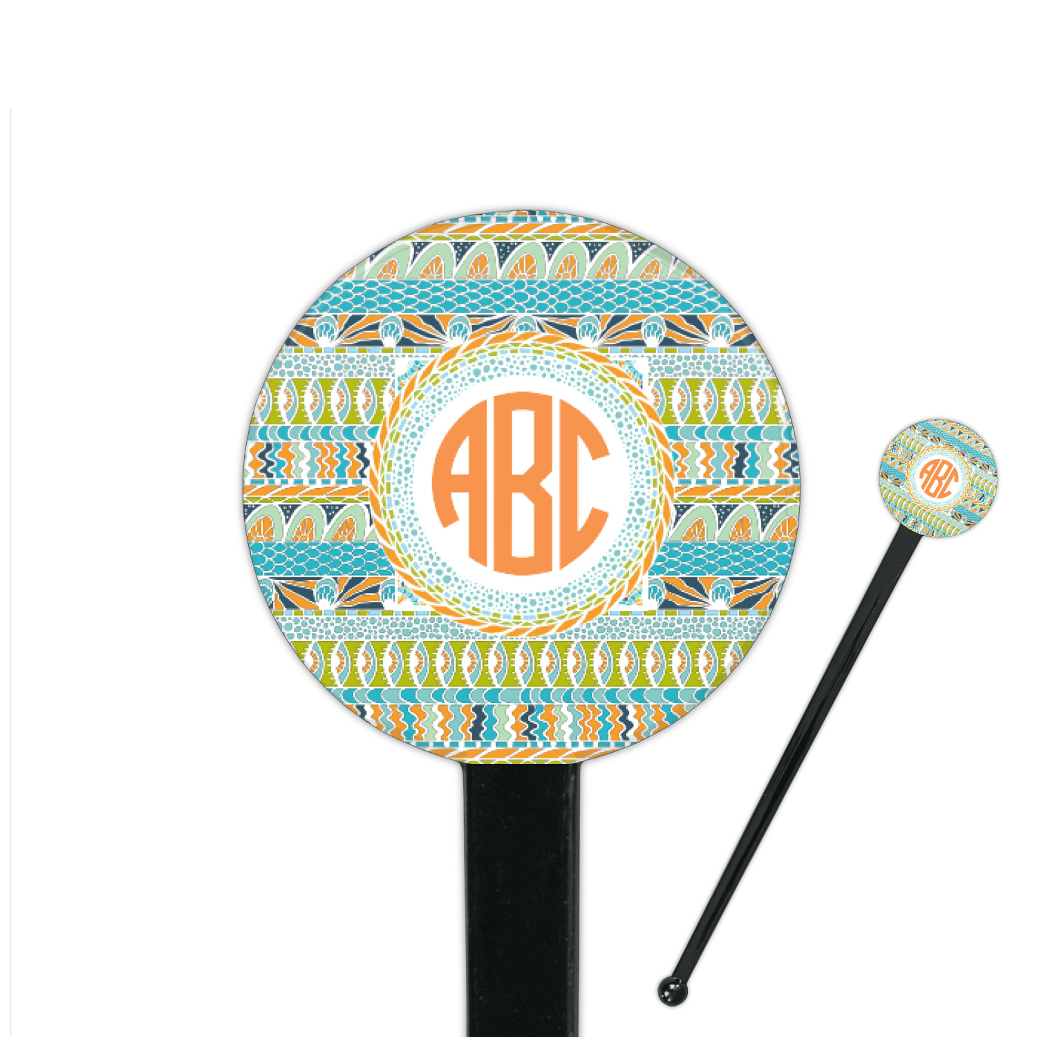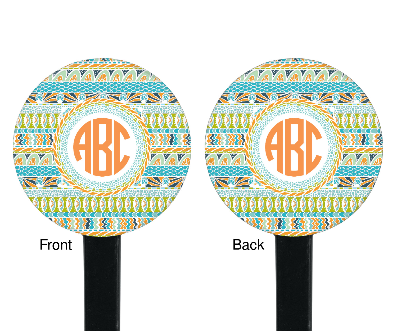 For our teal ribbon & labels design, we chose the straight ribbons with the labels in the concentric style. We chose a coordinating label with a circle monogram for personalization in the coordinating orange.