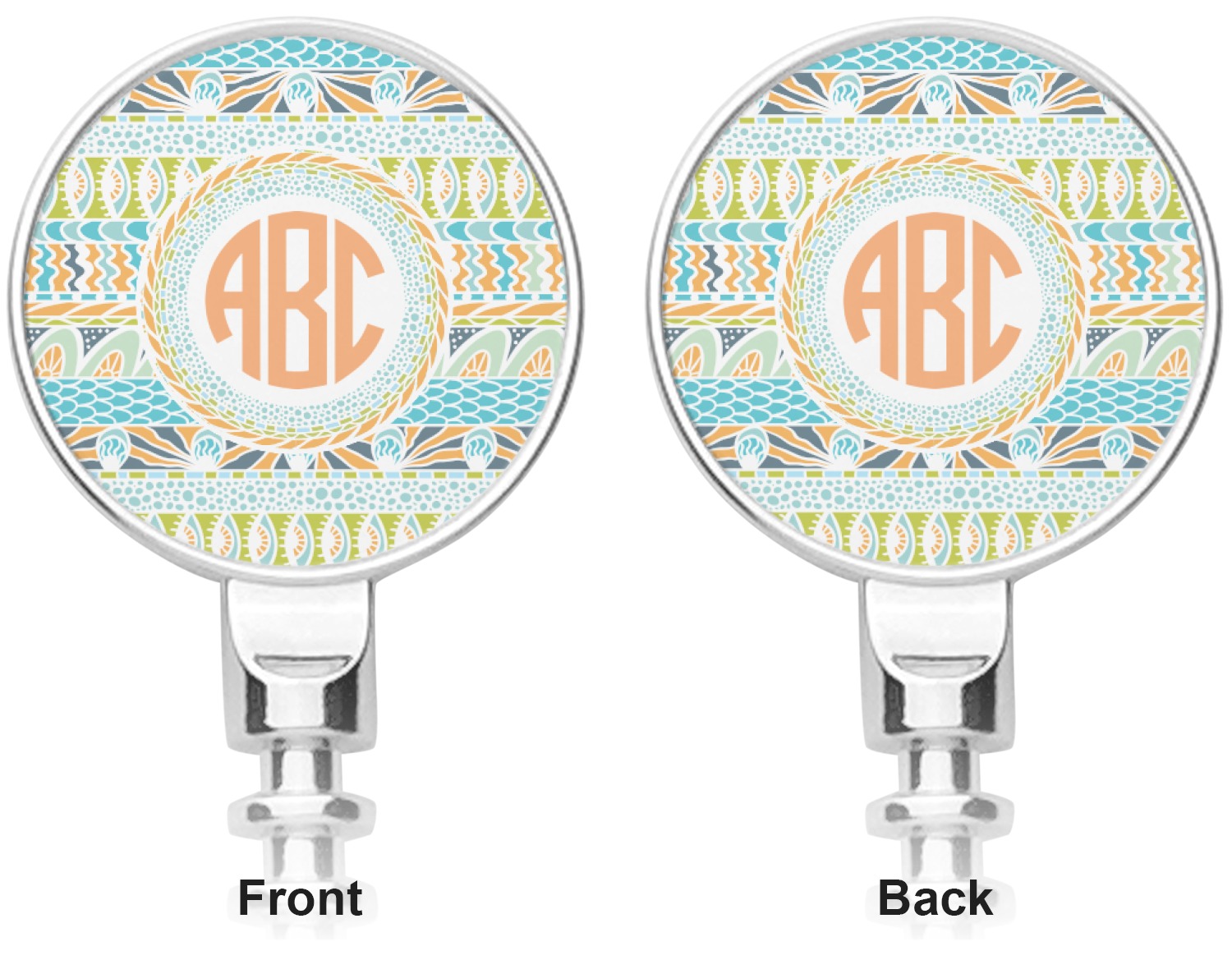 For our teal ribbon & labels design, we chose the straight ribbons with the labels in the concentric style. We chose a coordinating label with a circle monogram for personalization in the coordinating orange.