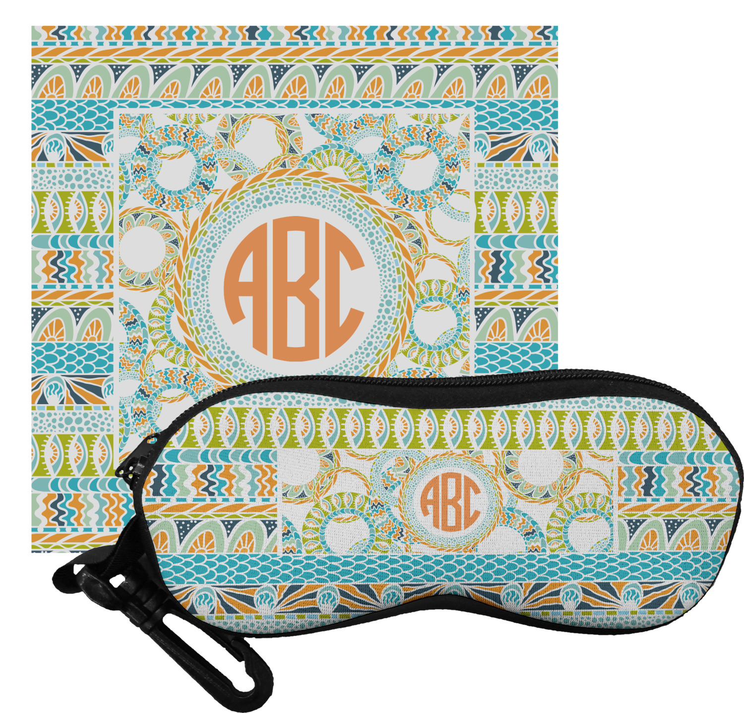 The cases have the design on both sides, a black zipper, and clips for hanging on a belt buckle or purse strap and also include matching lens cloths.