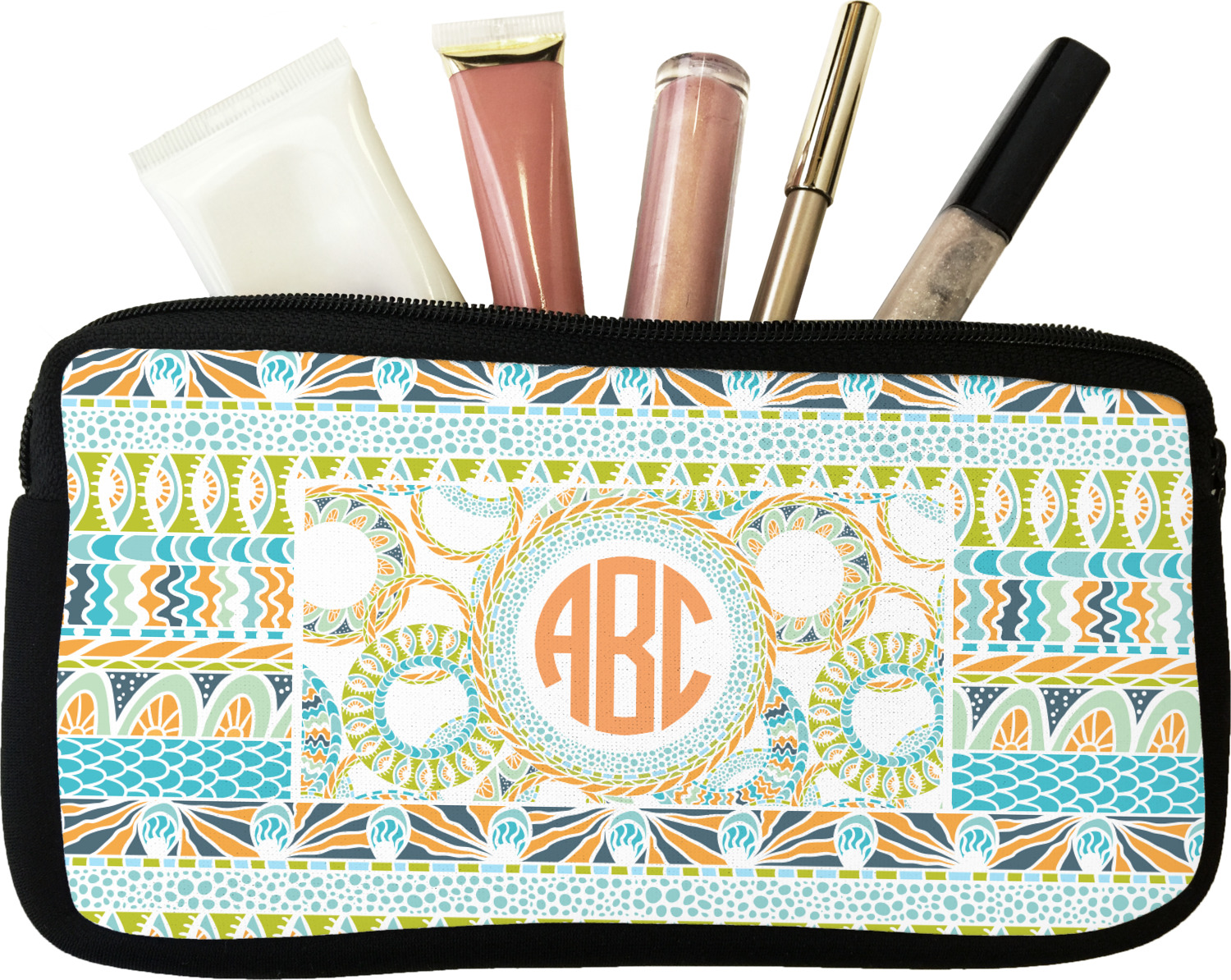 Our personalized makeup bags are available in many different designs, patterns and colors - so you are sure to find one that will love. They are made of neoprene (same material as wet-suits) and thus are water resistant, so spillages in your makeup bag will not end up all over you purse. They are customized on one side and are black on the other side and the zipper is black as well.