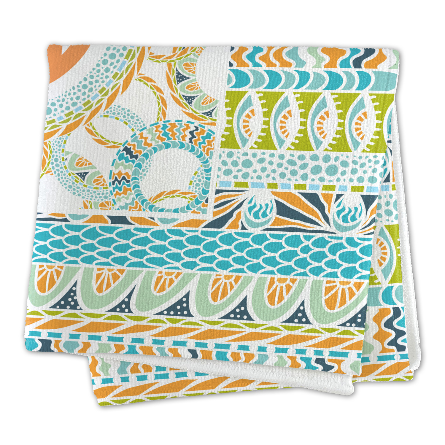 Love the colors and patterns in this design. It is a stunning combination of ribbons and labels in stunning teals with orange accent . This collection has four pattern repeats in it - the two you see here and two additional ones with wavy ribbons. Use the four to create a stunning bedroom or bathroom.