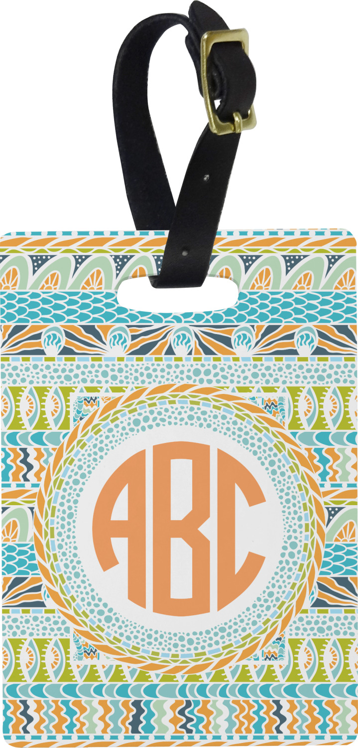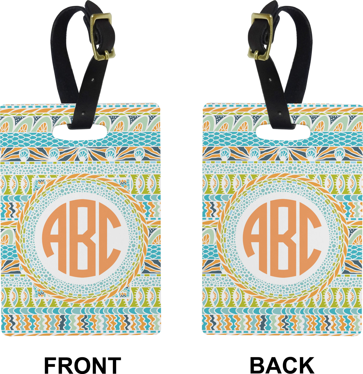 These personalized bag tags are sold in a variety of shapes, so that you may find the product that meets your vision exactly. We sell a round luggage tag, which measures at approximately 4" x 4". Our square luggage tag is about 3.5" x 3.5", while our rectangular version is 2.75" x 4 ".