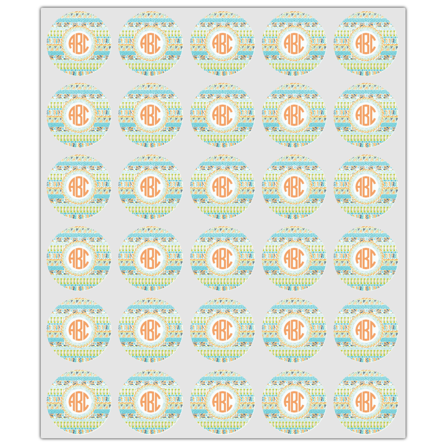 For our teal ribbon & labels design, we chose the straight ribbons with the labels in the concentric style. We chose a coordinating label with a circle monogram for personalization in the coordinating orange.