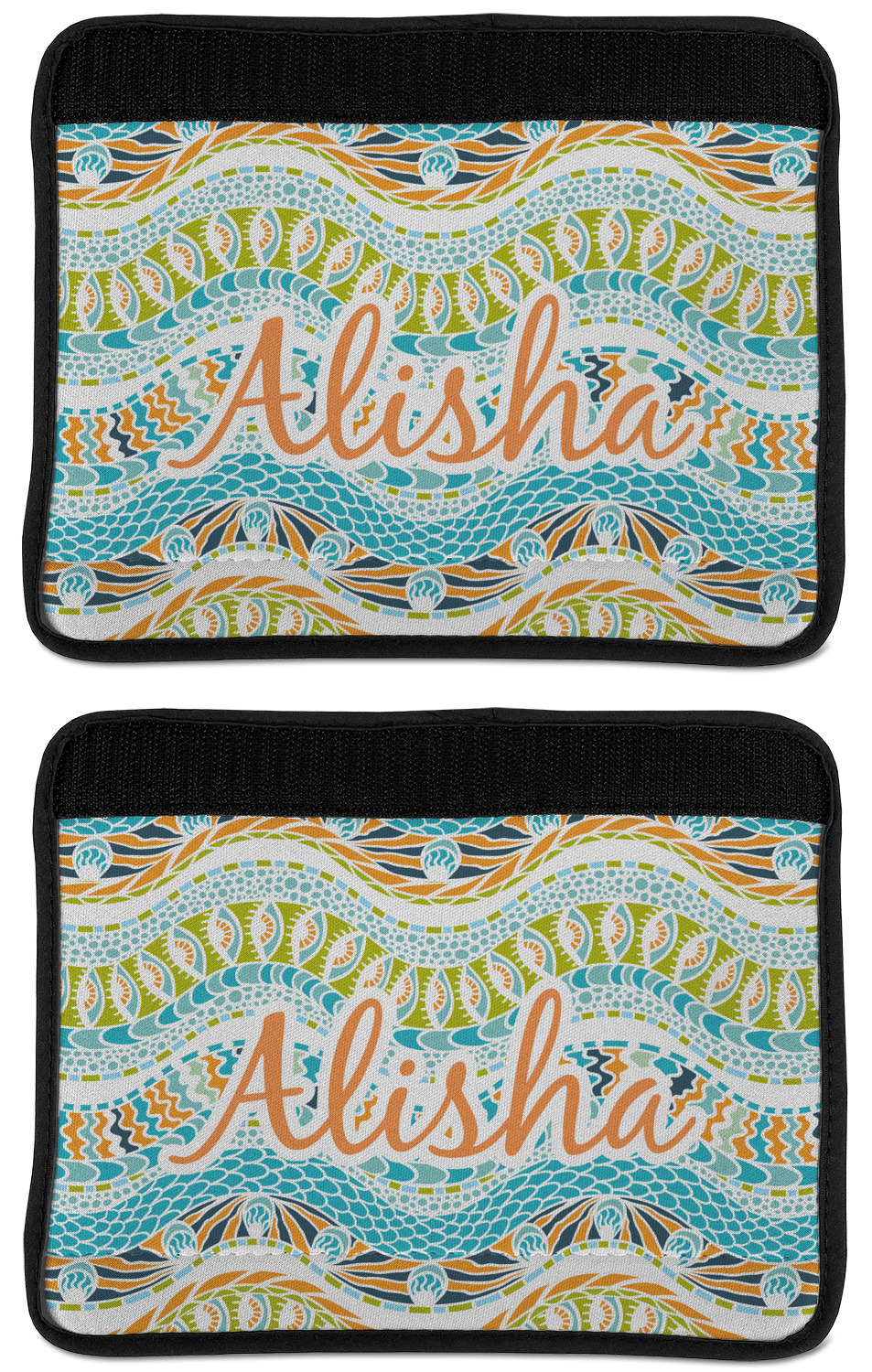Made from neoprene, our seat belt strap covers wrap around the belt itself and have a Velcro tab for easy attachment and closure. The belt's edges are trimmed with a black polyester for a secure finish. Each cover is 9.5 by 7 inches when open and 9.5 by 2.5 inches when closed. We print your personalized design on the face of the seat belt pad.