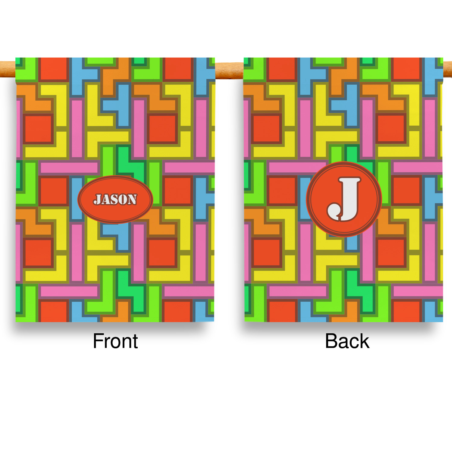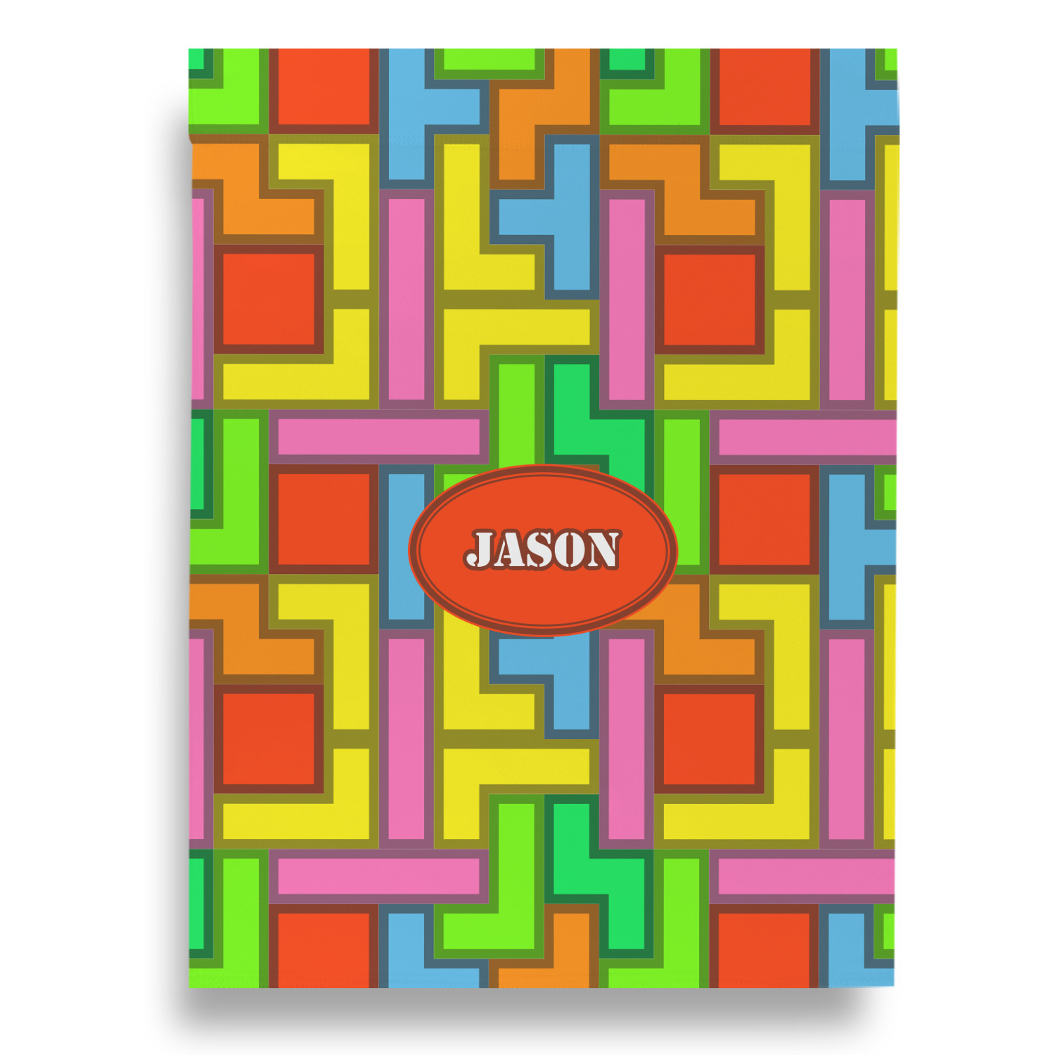 The tetromino print offers all the classic colors and shapes to delight a true gamer. A big oval label breaks up the pattern and highlights the personalization of your choice.