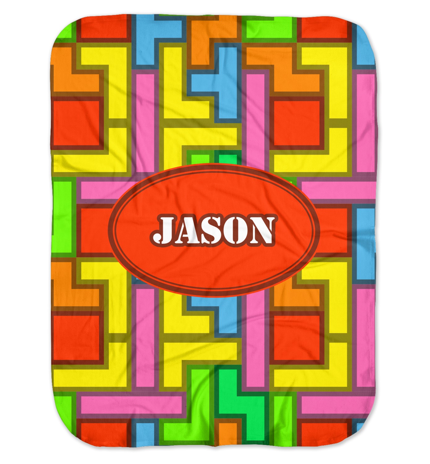 The tetromino print offers all the classic colors and shapes to delight a true gamer. A big oval label breaks up the pattern and highlights the personalization of your choice.