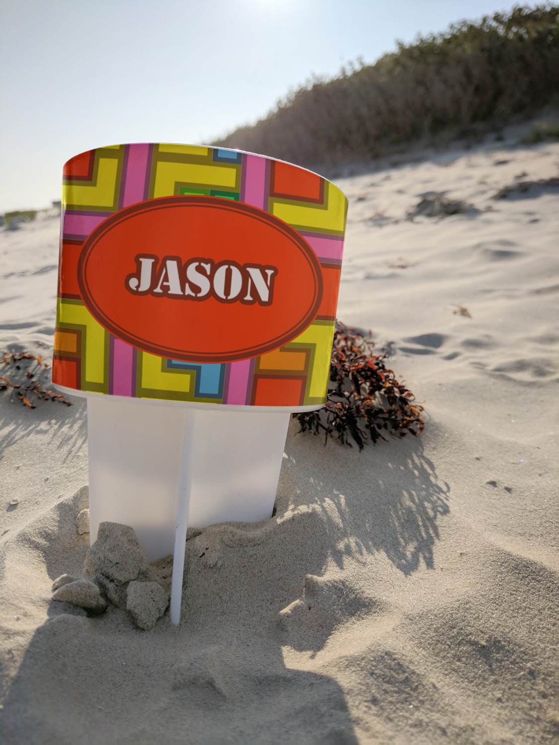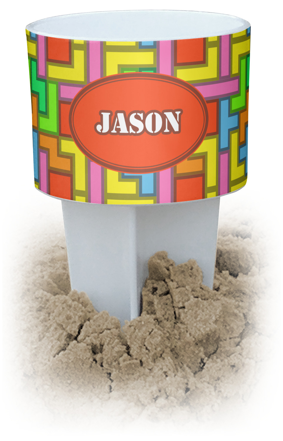 This cup holder has a large stake at its bottom that anchors it to the sand or ground below, while the cup holder rests above the stake. The entire drink holder is made of durable plastic and displays your customization around the cup holder portion. We sell these personalized beach spikers in two different colors: black and white.