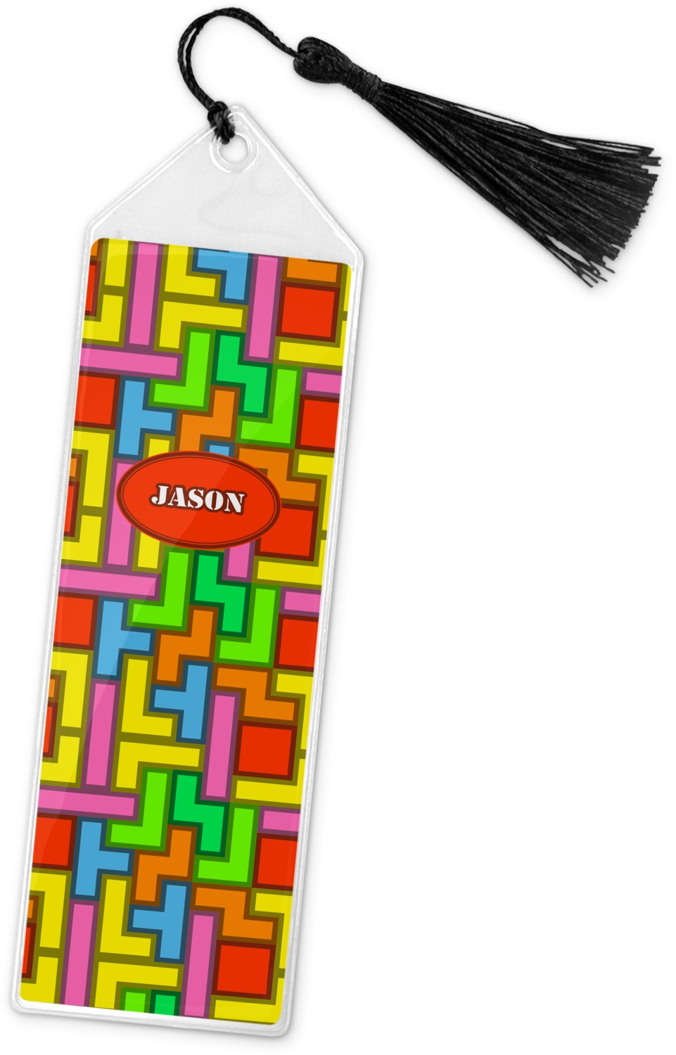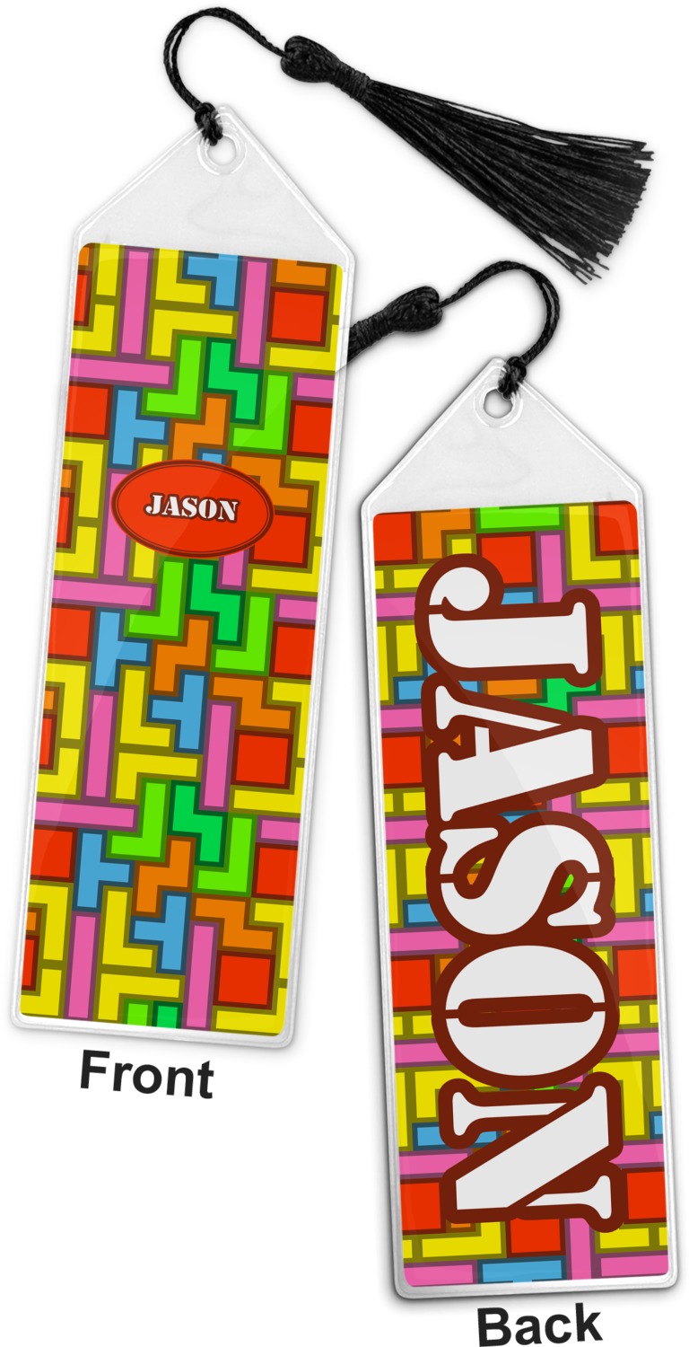Your personalized bookmark is made of a sturdy, clear vinyl, and is approximately 7.5" x 2.25". We display your personalization on vinyl inserts that are placed on both sides. Accompanying each book marker is a black, fringe tassel that attaches to the reinforced, triangular header.