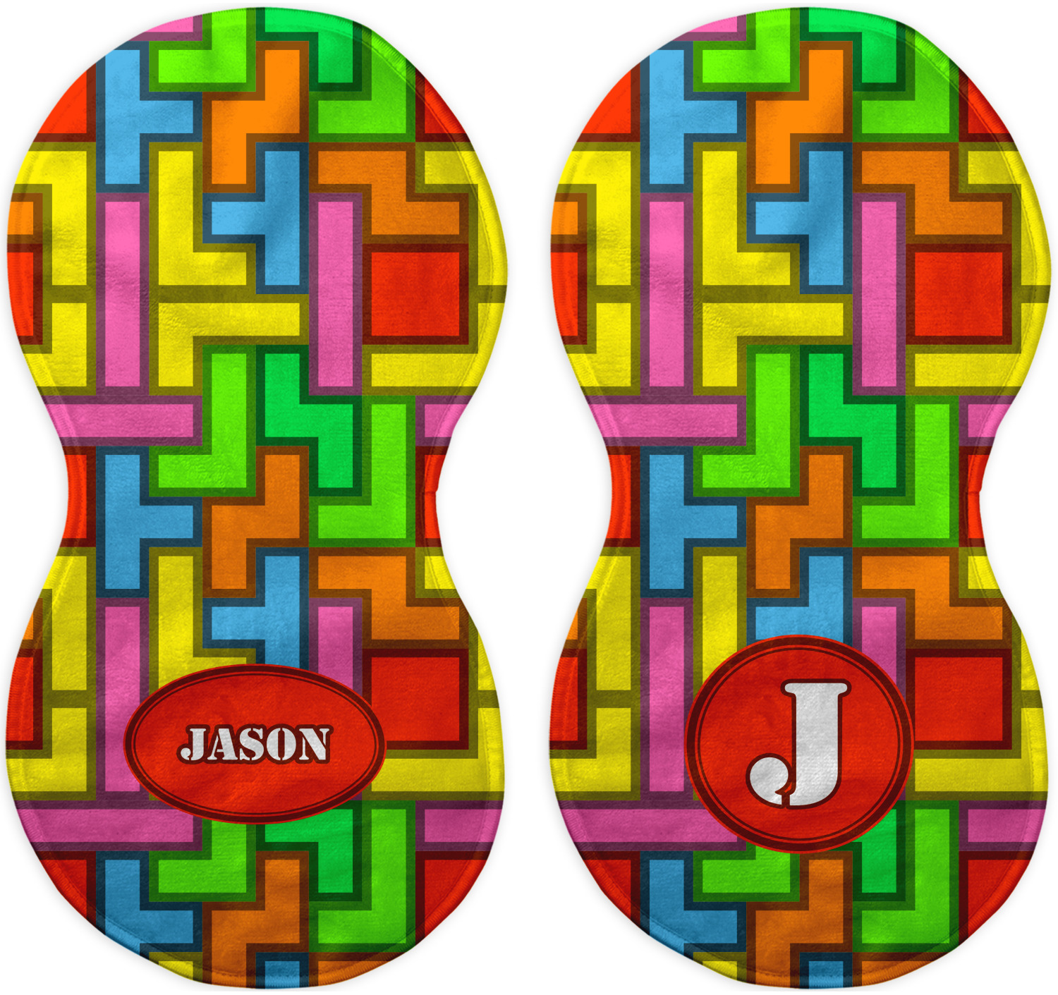 The tetromino print offers all the classic colors and shapes to delight a true gamer. A big oval label breaks up the pattern and highlights the personalization of your choice.