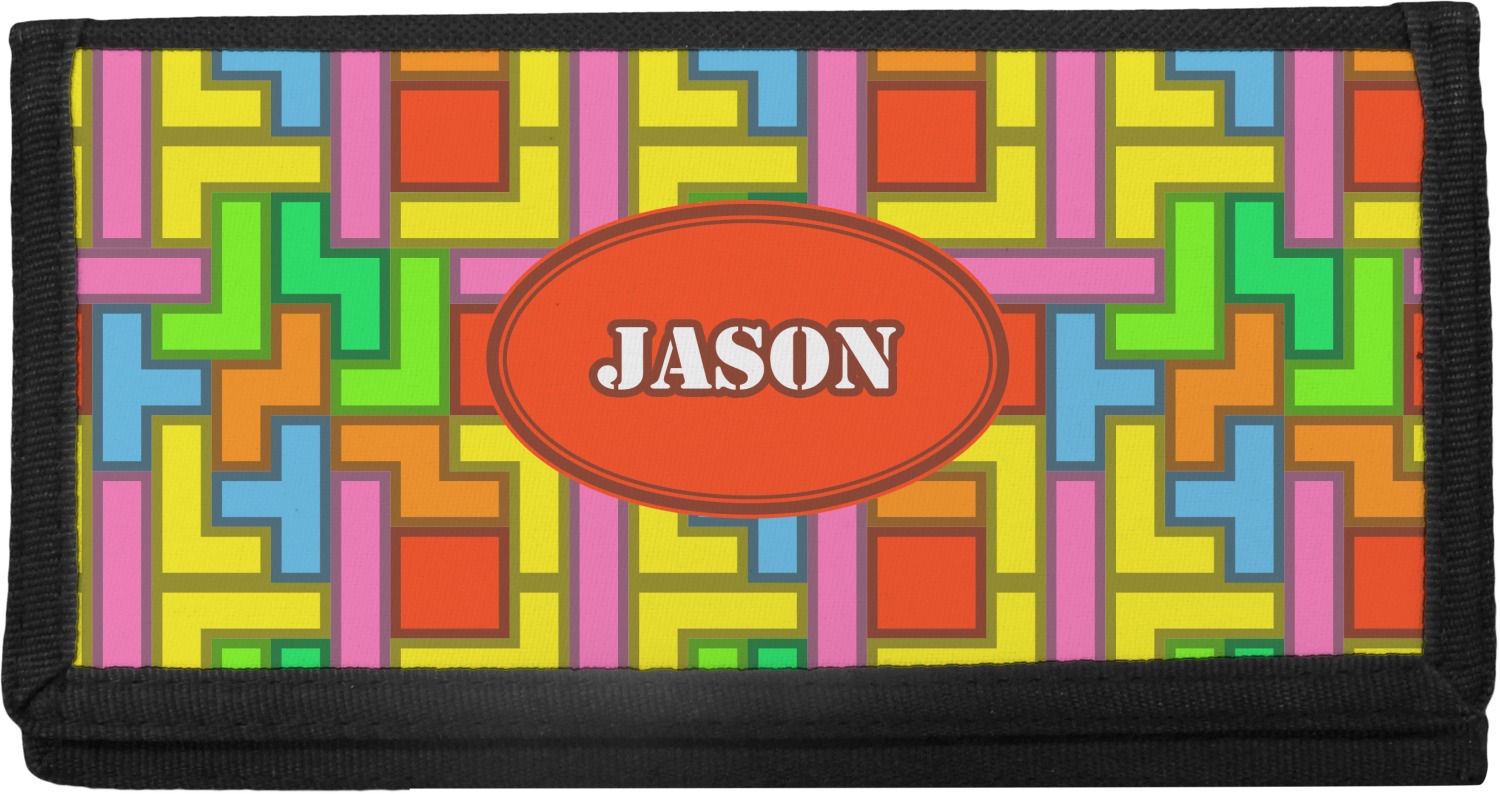 The tetromino print offers all the classic colors and shapes to delight a true gamer. A big oval label breaks up the pattern and highlights the personalization of your choice.