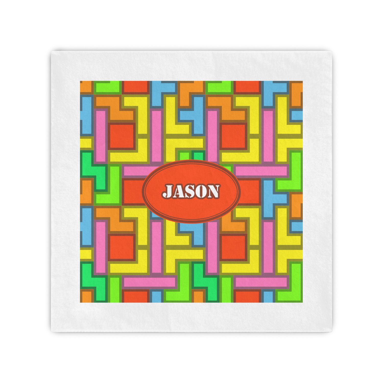The tetromino print offers all the classic colors and shapes to delight a true gamer. A big oval label breaks up the pattern and highlights the personalization of your choice.