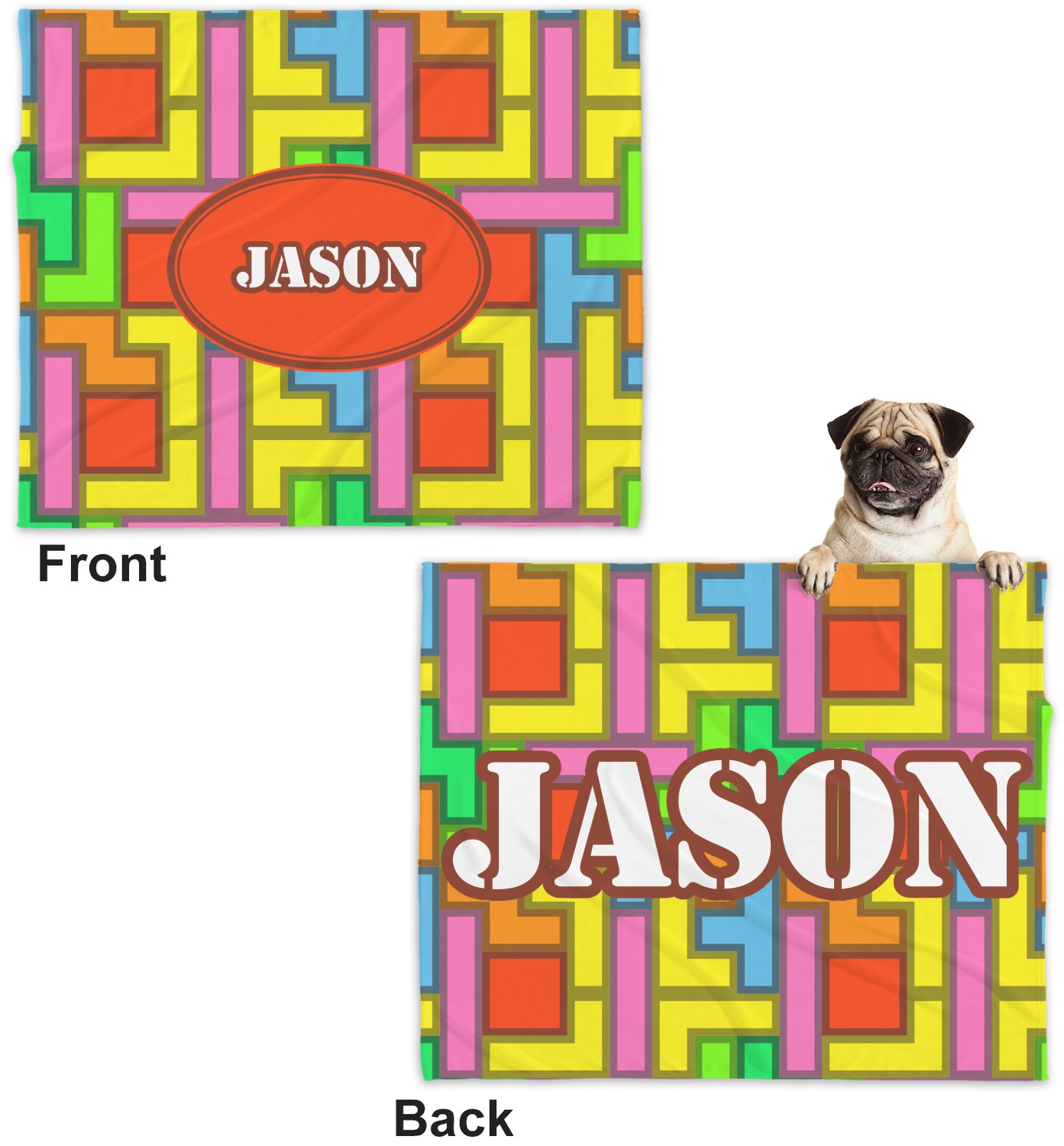 These dog blankets are crafted from a gentle, soft-to-the-touch, minky material. We print your customizations, either matching or differing, on both the top and underside of the blanket. These personalized dog blankets are available in two sizes: regular and large. Our regular size, at 40" x 30", accommodates small and some medium size dogs. At 60" x 50", our large dog blanket is a better fit for bigger breeds. Though specialized for dogs, these blankets still make a thoughtful gift for your favorite feline, or any other pet in mind!