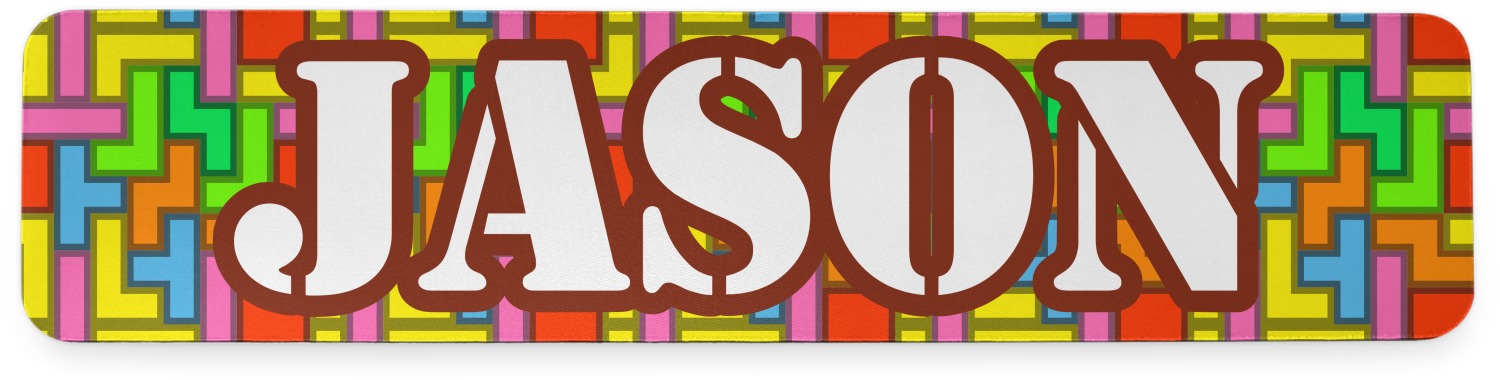The tetromino print offers all the classic colors and shapes to delight a true gamer. A big oval label breaks up the pattern and highlights the personalization of your choice.