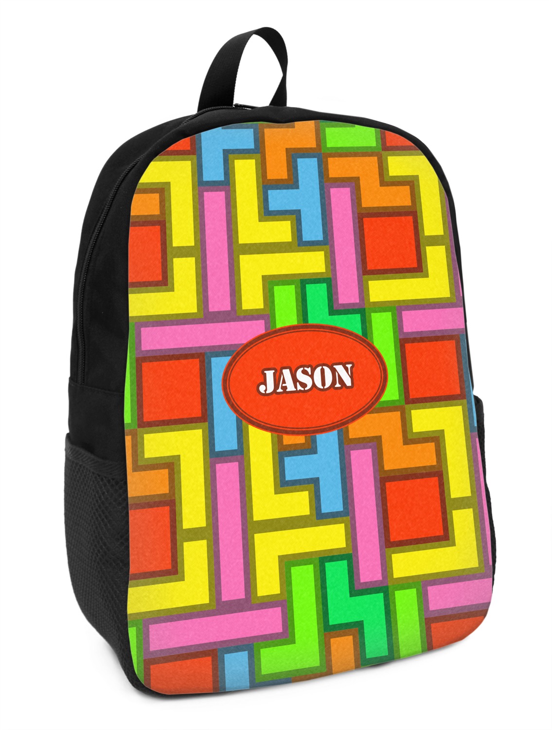 The tetromino print offers all the classic colors and shapes to delight a true gamer. A big oval label breaks up the pattern and highlights the personalization of your choice.