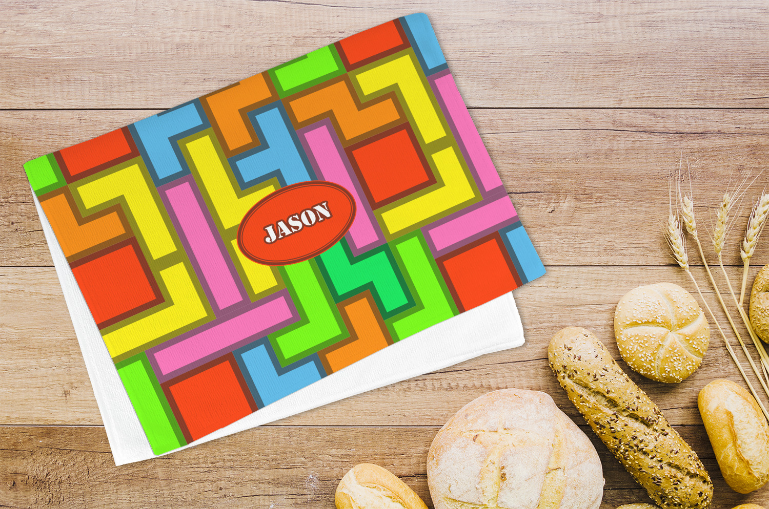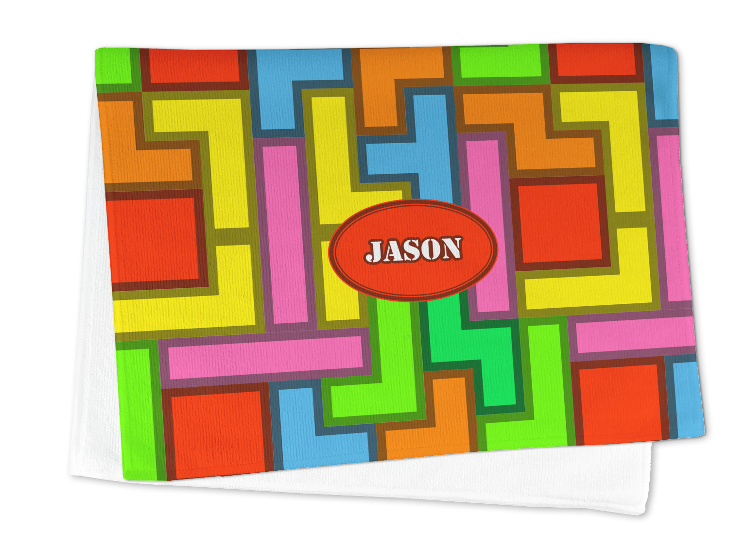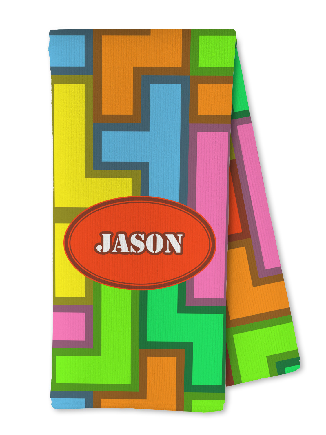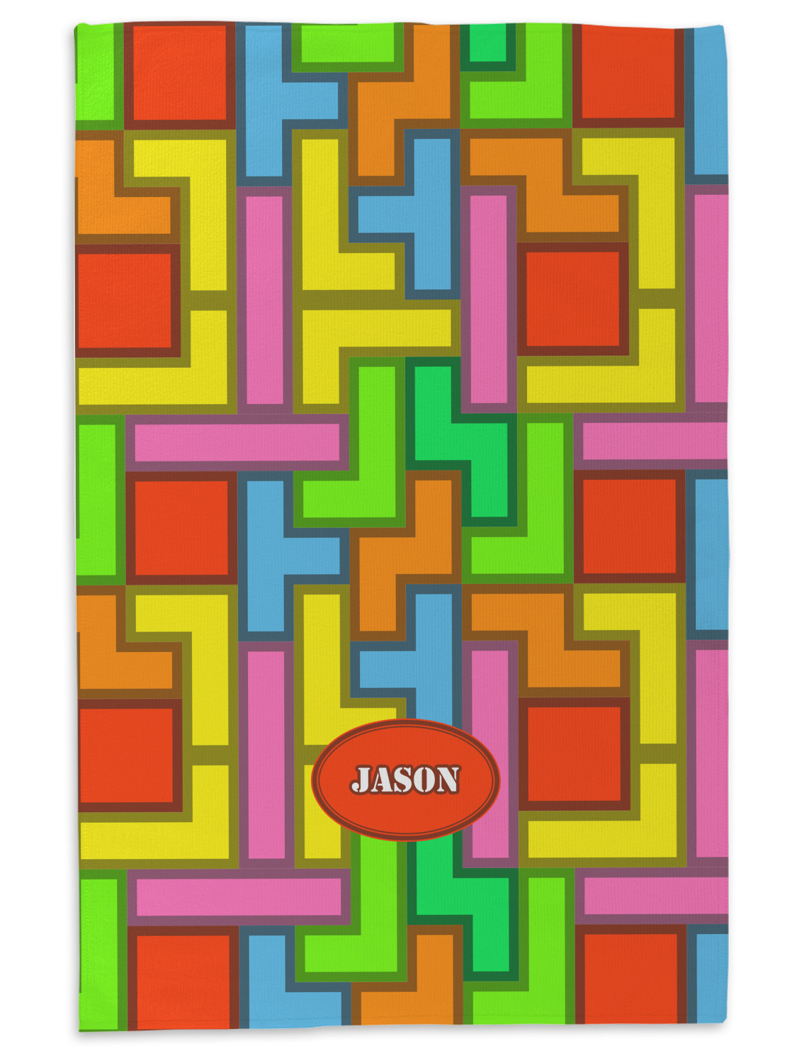 The tetromino print offers all the classic colors and shapes to delight a true gamer. A big oval label breaks up the pattern and highlights the personalization of your choice.