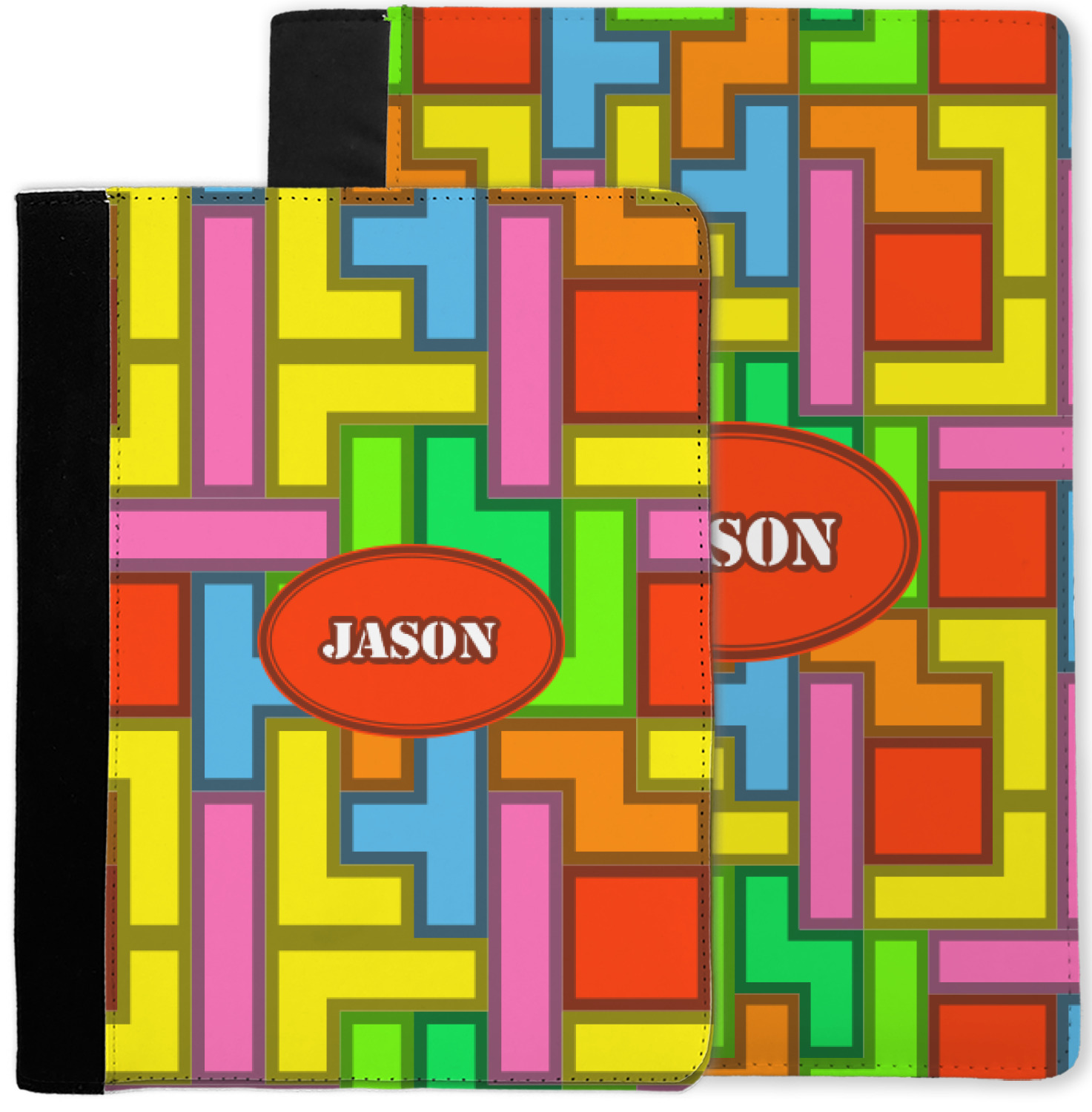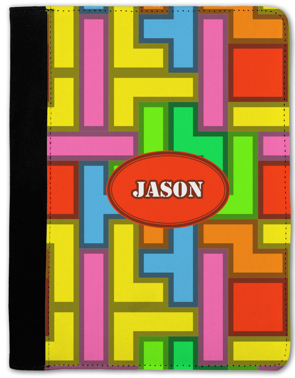 The tetromino print offers all the classic colors and shapes to delight a true gamer. A big oval label breaks up the pattern and highlights the personalization of your choice.
