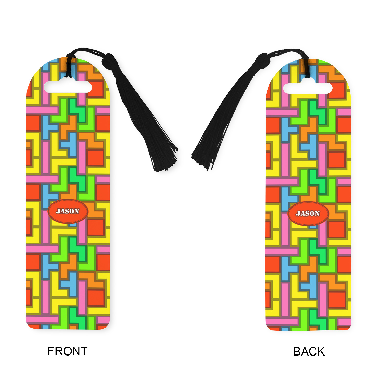 Made from a durable, flexible plastic, these bookmarks are printed with your custom design on them. With the tassel on them they make it easy to find your page in your book. These are a rectangular shape 7 1/4 inches tall with a rounded top and are approximately 2 1/4 inches wide.