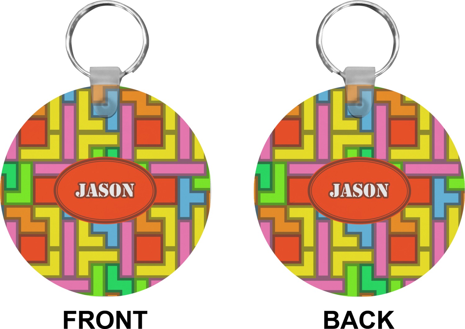 Our personalized keychains attach to the included metal, split key ring with a plastic, removable snap. Since a metal ring is included with your purchase, you have the liberty to keep your keys together on the ring, with or without your unique keychain. We offer this keychain in three different shapes: circle, heart, or diamond. We print your personalized design(s) on both sides of the key chain, and the surface has a glossy, reflective finish that only emphasizes your design. Each keychain is approximately 2.25 by 2.25 inches.