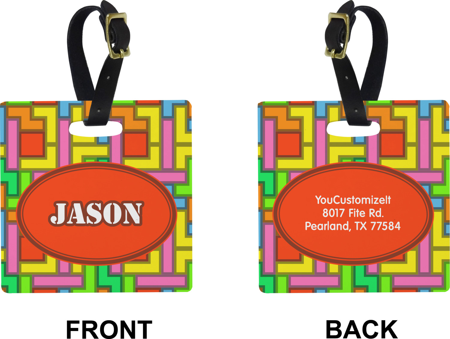 These cute luggage tags are made of a fiber-reinforced, UV-resistant plastic, making them waterproof and durable enough for both everyday use and the rugged adventures of any traveler! A leather strap with holes and a buckle is included with your purchase and can be used to attach your custom luggage tag to any suitcase, backpack, or duffel bag. You can design these travel tags as you wish; your customization will be displayed across the front, while the back will show as little or as much personal information as you want.
