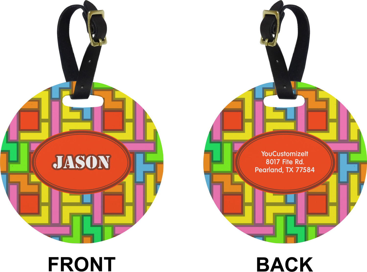 These personalized bag tags are sold in a variety of shapes, so that you may find the product that meets your vision exactly. We sell a round luggage tag, which measures at approximately 4" x 4". Our square luggage tag is about 3.5" x 3.5", while our rectangular version is 2.75" x 4 ".