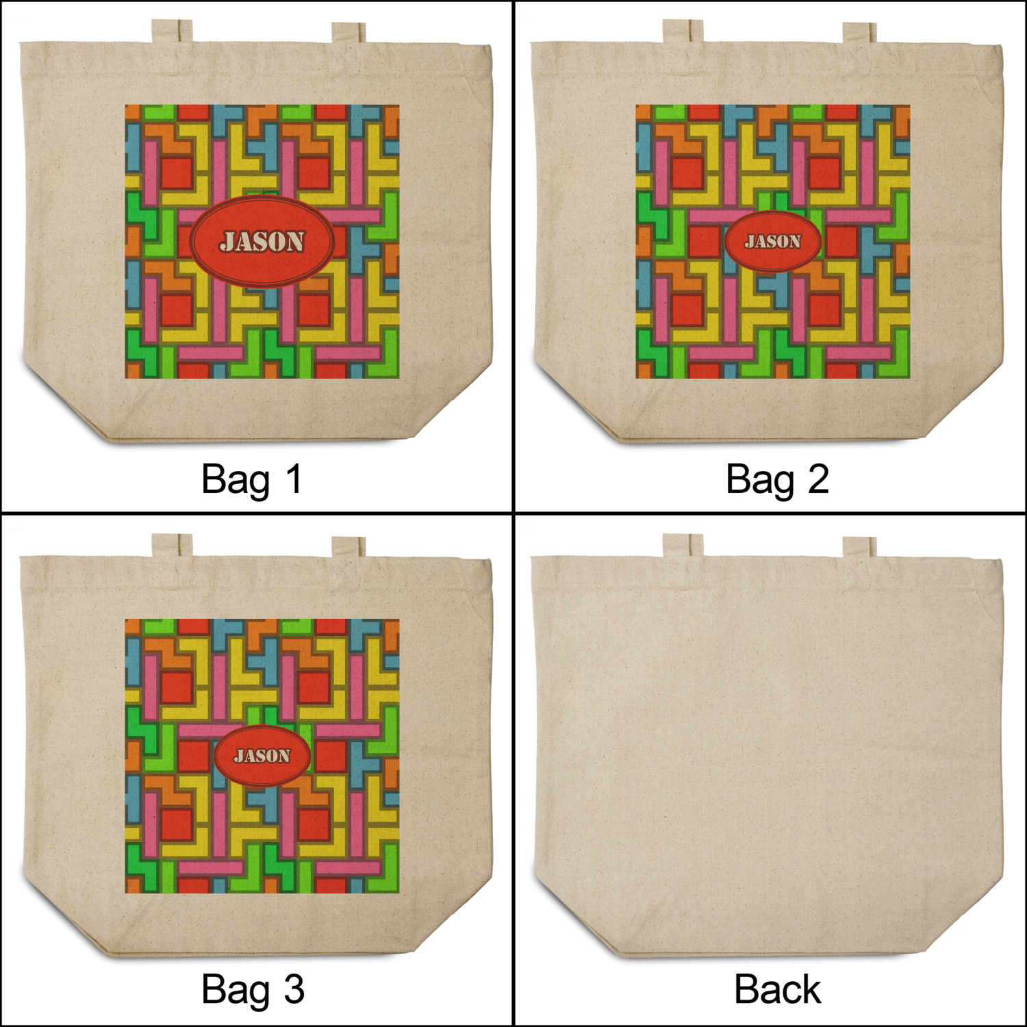 The tetromino print offers all the classic colors and shapes to delight a true gamer. A big oval label breaks up the pattern and highlights the personalization of your choice.