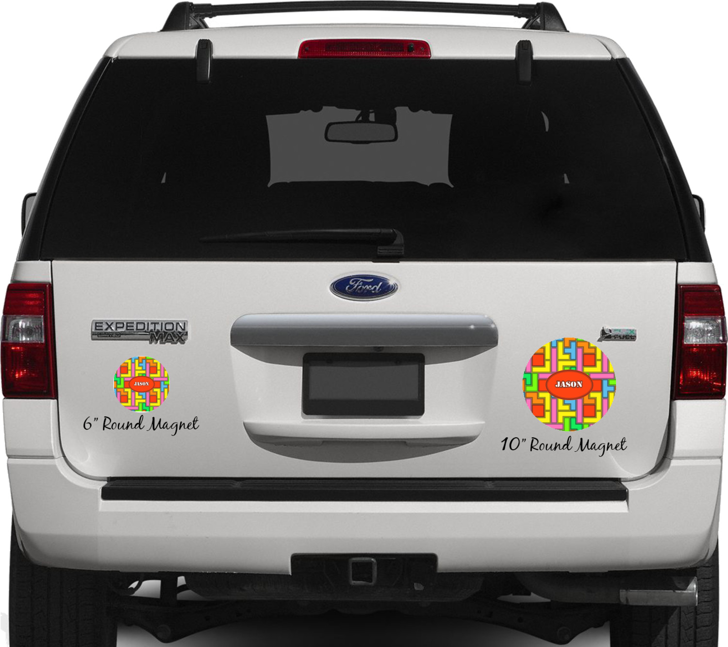 Your personalized car magnets are available for purchase in two shapes and two sizes. We carry round and square editions; each shape can either be 6 by 6 inches, or 10 by 10 inches, depending on your needs. Both versions are 1 millimeter thick, which is considered, within the industry, as the ideal thickness for automobile magnets. The magnetic car decals will adhere to any smooth, metal surface of your cars body, such as the trunk door or a side panel. However, please note that some vehicles are constructed from fiberglass bodies, which prevents the adhesion of anything magnetic. We advise that you test your vehicle before purchasing these magnets.