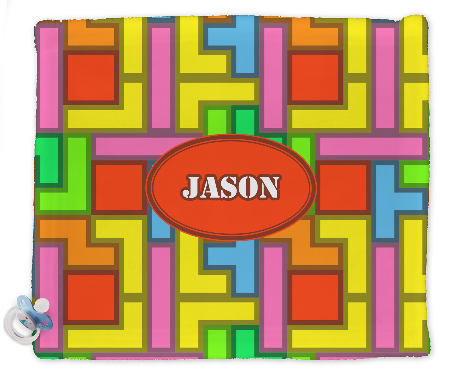 The tetromino print offers all the classic colors and shapes to delight a true gamer. A big oval label breaks up the pattern and highlights the personalization of your choice.